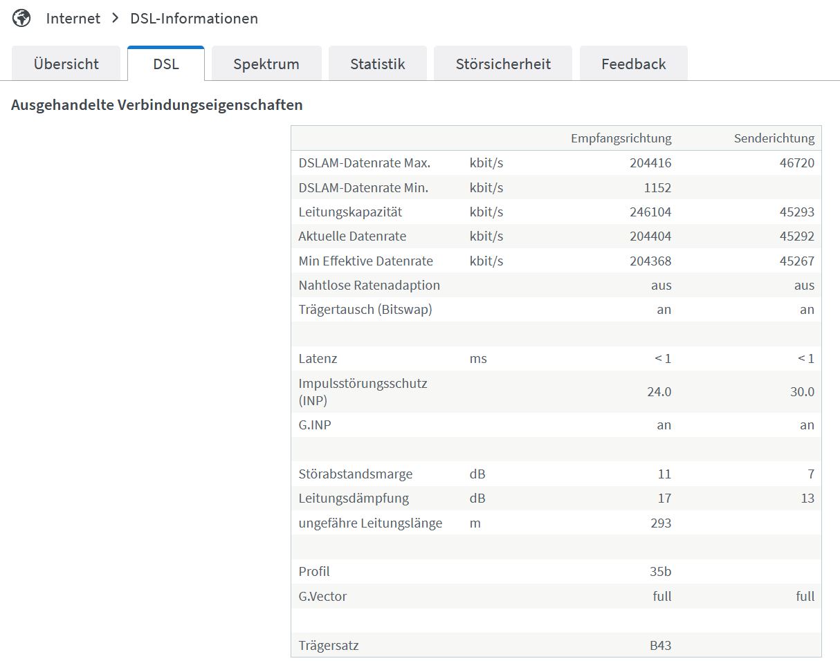 Und das Spektrum. Dann kann man auch genau sagen ob zu lang oder irgendwie gestört.Schrotti schrieb:Zeige doch bitte mal die Option -> Internet -> DSL Information -> DSL.