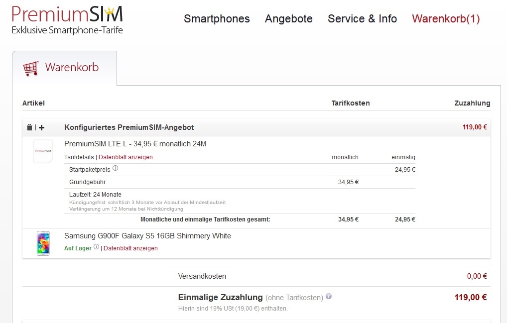 Monatlich ebenfalls 34,99€, zzgl. einmalig 15€ für das blaue Samsung Galaxy S5.