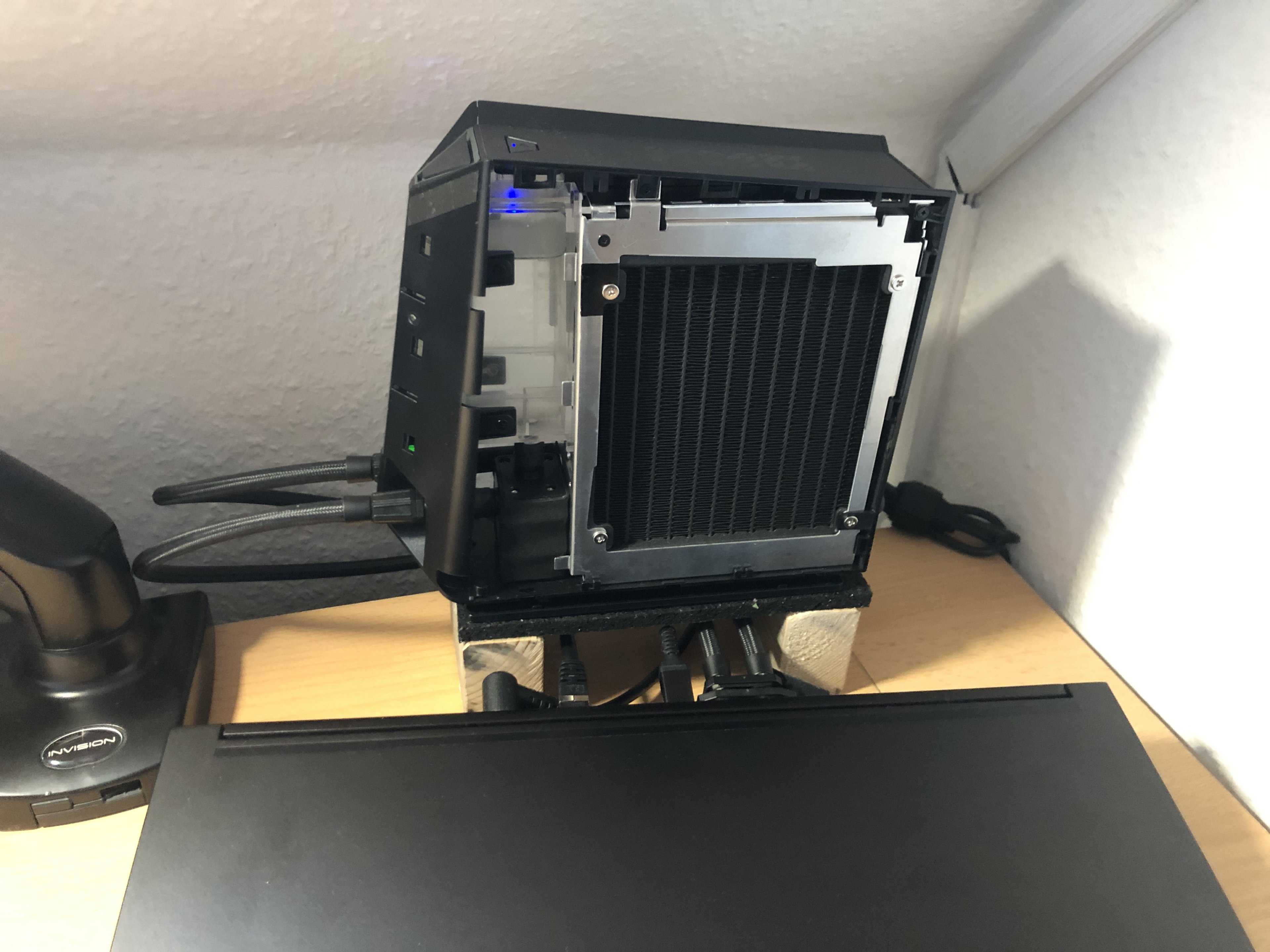 Lüfter und Pumpe laufen mit 12V. Der Lüfter kann mit PWM gesteuert werden und hat eine Drehzahlrückmeldung. Ich habe den Lüfter ausgebaut, er war mit 4 Schrauben am Wärmetauscher befestigt ohne Entkopplung mit Gummis. Zum Test mal mit 12V laufen lassen, da ratterte er auch leicht. Als ich ihn wieder eingebaut habe war das Rattern verschwunden 🤨. Jetzt ist der Lüfter echt leise, nur die Luftgeräusche kann man hören. Ansonsten muss ich sagen, dass alles gut verarbeitet wurde.