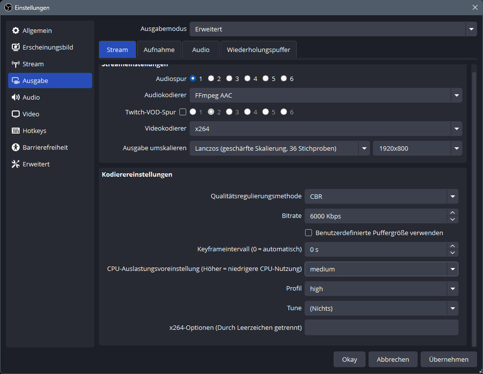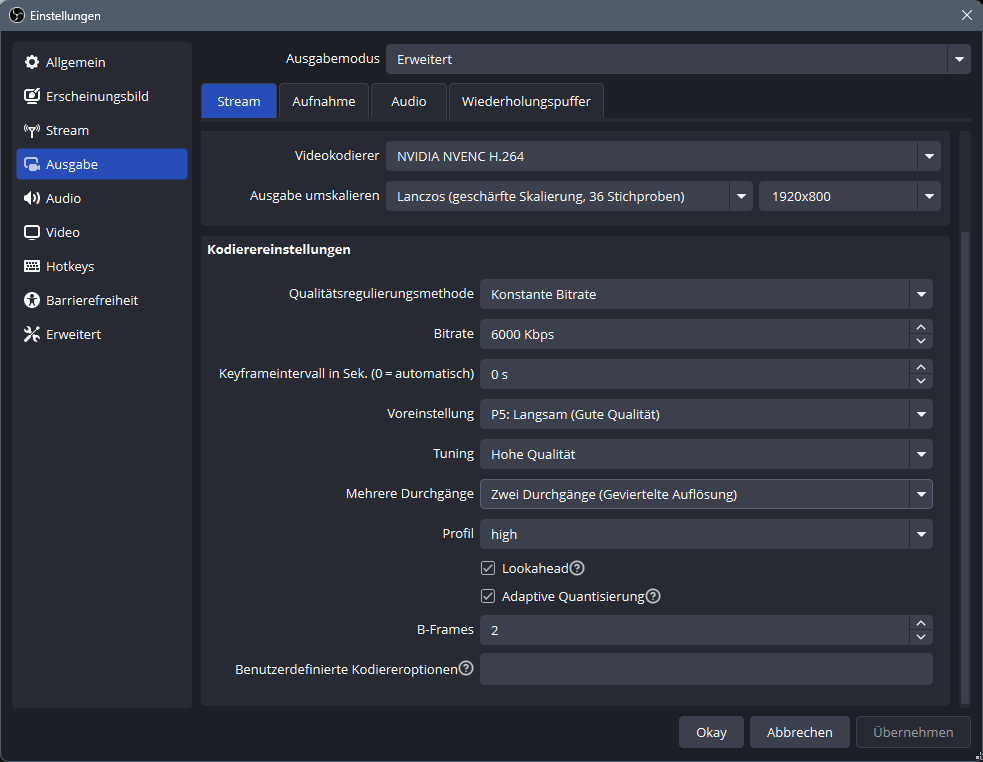 So sieht das bei mir aktuell aus. Gameauflösung ist immer 3840x1600, wird auf 1920x800x60FPS Encodingauflösung runterskaliert.