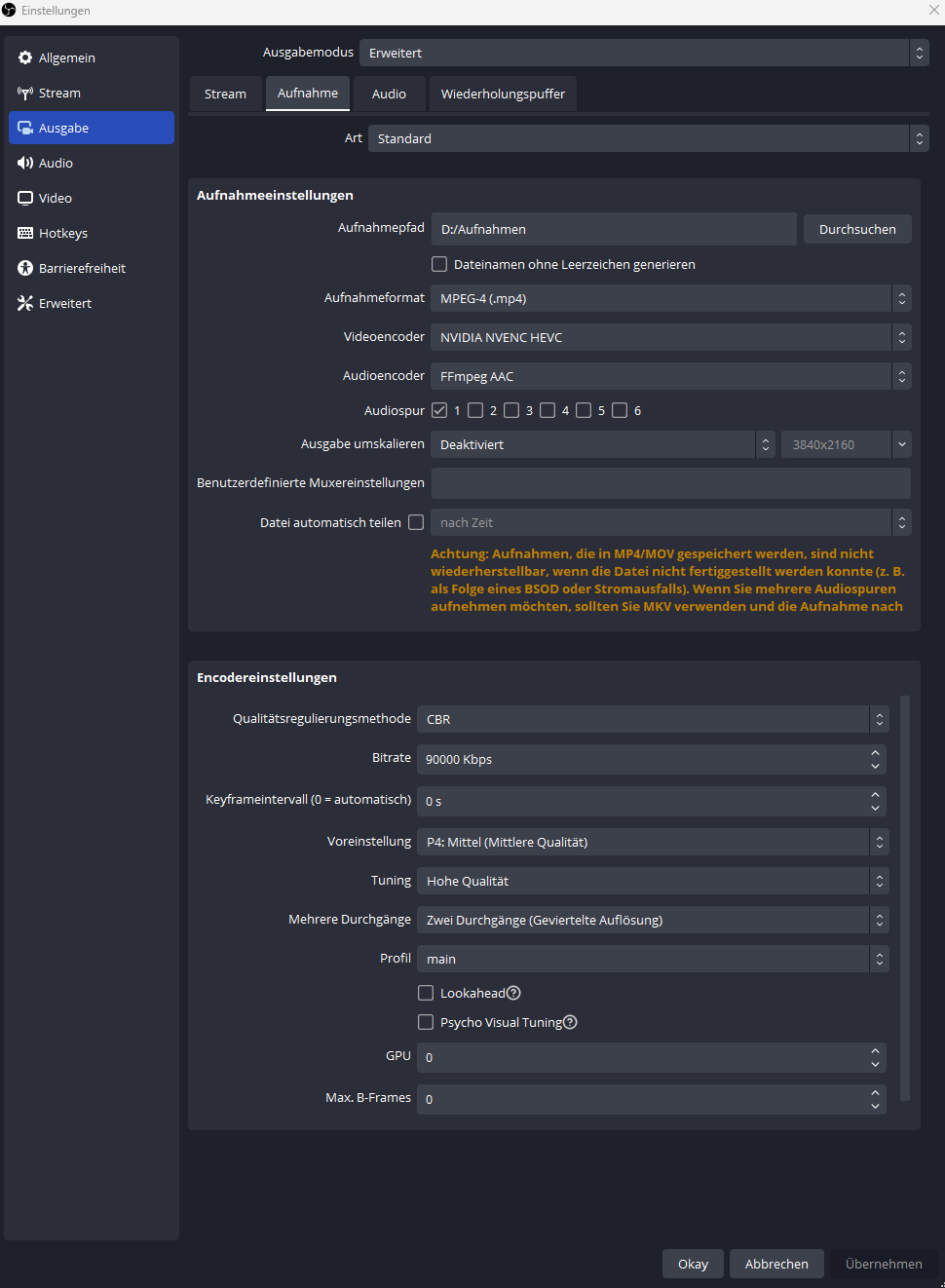 Im Moment nutze ich noch Shadowplay, wüsste aber gerne, ob man mit OBS die gleiche Aufnahmequali bei weniger MBit hinbekommt. Bei Shadowplay brauche ich bei 4K/60Hz garnicht unter 30MBit anfangen, weil ich da zuviel Artefakte bekomme. Daher lasse ich es auf Standard (50MBit). Würde gerne mal OBS probieren, aber die Einstellmöglichkeiten schrecken mich ab