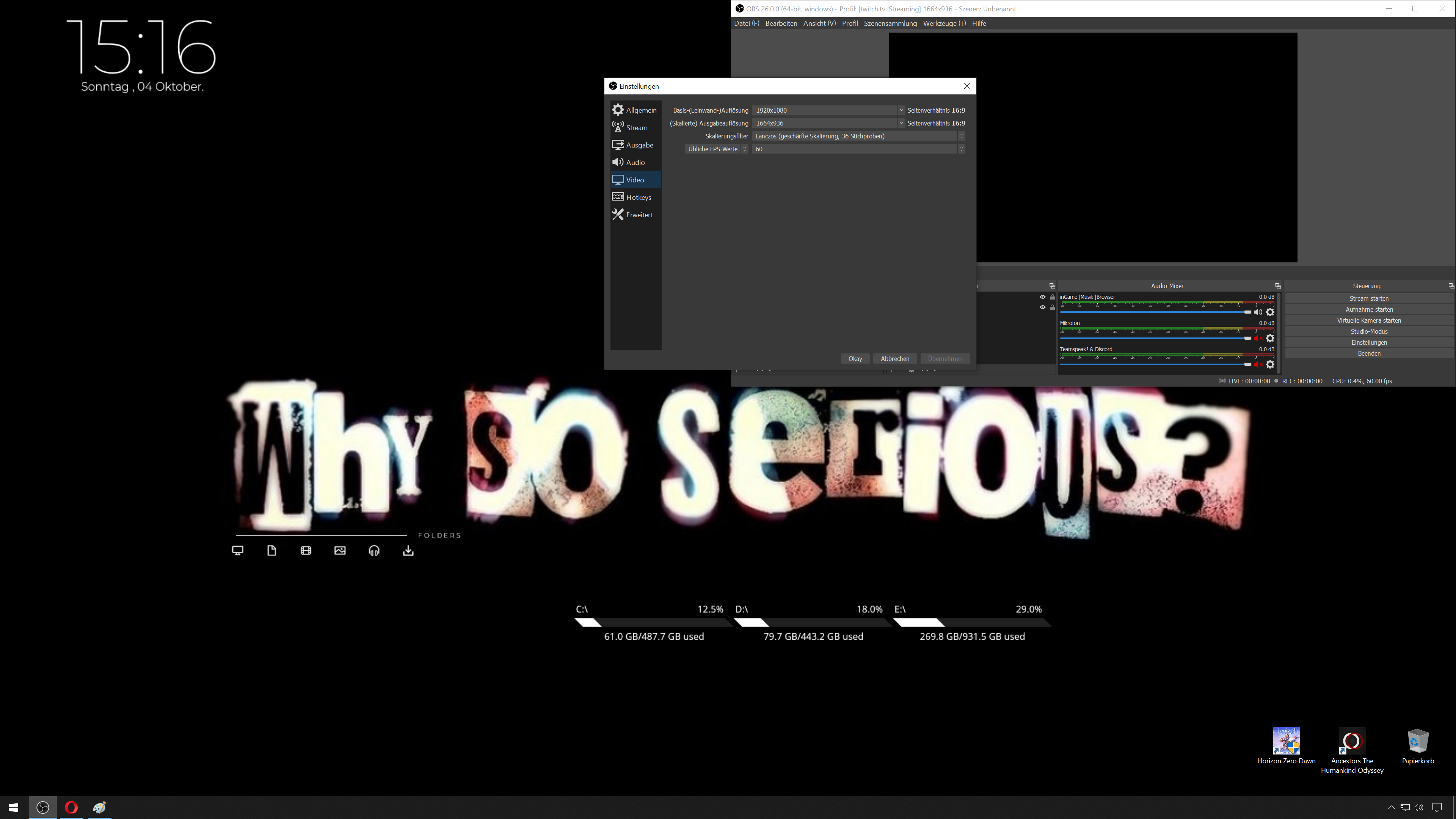Ich sehe du probierst gerade etwas, wenn es so absolut nicht läuft probierst wieder mit Canvas auf 3840x2160 aber skalier die Auflösung wirklich nur bei der Ausgabe nicht bei Video wenn du vorhast in verschiedener Auflösung aufzunehmen und zu streamen, sonst darfst du jedes mal wenn du zwischen Aufnahme und Stream wechselst bei Video eine andere Auflösung eintragen.
