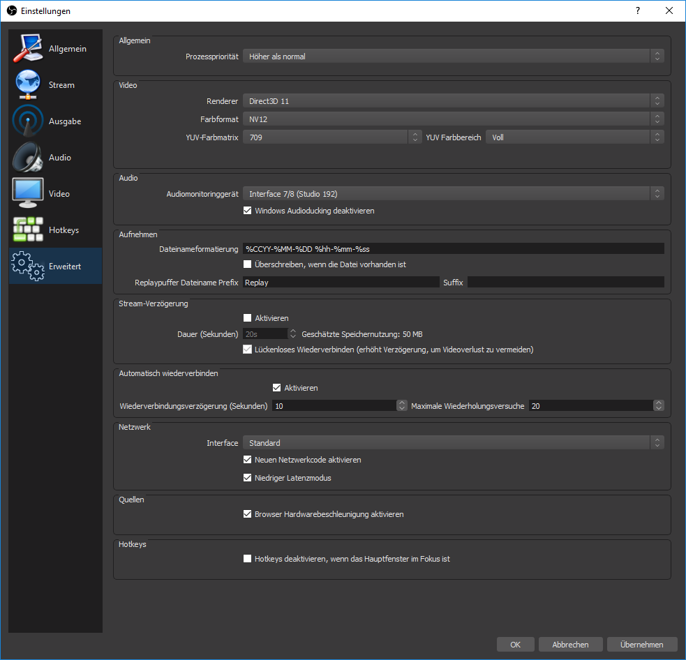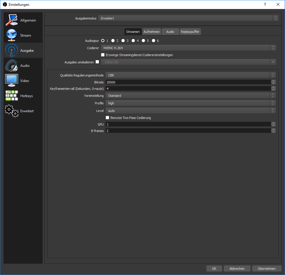 Der Stream läuft für gewöhnlich auf 1440p60fps@20Mbit/s, jedoch hat auch eine geringere Einstellung von 720p60fps@5Mbit/s keine Abhilfe geschaffen.