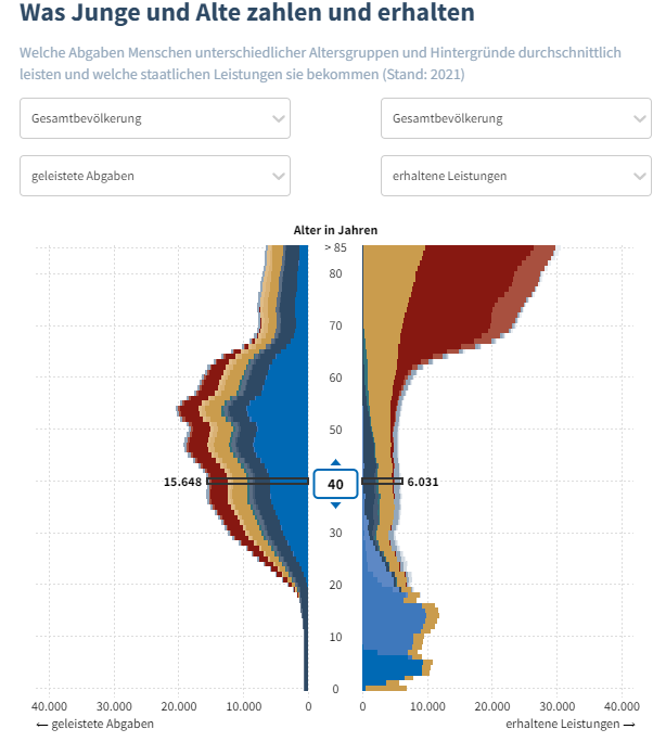 Im Schnitt investiert der Staat 20 Jahre lang in einen Menschen, bis dieser anfängt zu arbeiten. Die nächsten 20 Jahre verbringt der Durchschnittsdeutsche damit, seine erhaltenen Leistungen durch Steuerzahlungen auszugleichen.