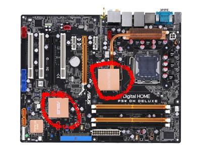 a) das MB an den Stellen im Bild relativ heiß ist. Hab ya das Asus P5W DH Deluxe und ich hab gehört, dass man bessere Temps bekommt, wenn man bei den markierten Stellen im Bild die Bleche (oder was das sind) mit dem Logo wegmacht. Stimmt das?