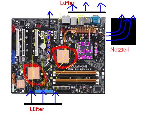 Gehäusebelüftung sieht so aus, dass vorne Luft reingeblasen wird, die verteilt sich im Gehäuse (nach unten zur Graka etc. und nach oben zur CPU) und wird hinter dem CPU Kühler wieder rausgeblasen (siehe Bild):