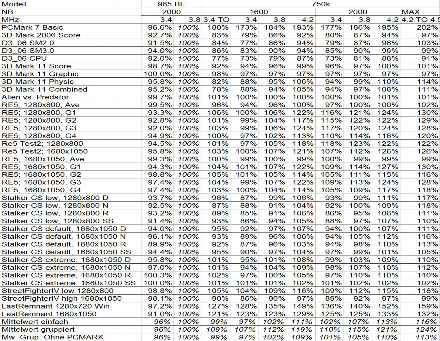 Man muss nun die Mittelwerte der Ergebnisse etwas differenzieren. Es wurde einmal der einfache Mittelwert (Alle Werte im Schnitt) und einmal der gruppierte Mittelwerte genommen (z.B. Alle Stalker zusammen genommen) bzw. noch einmal ohne PC Mark7.