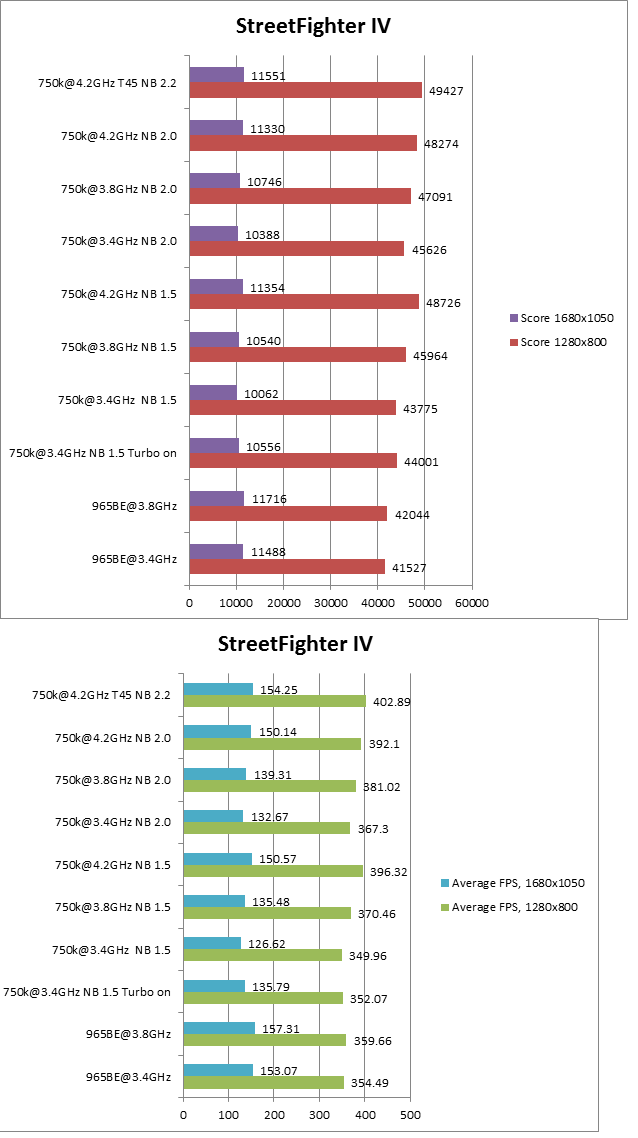 Bei StreetFigher kann man in Low noch Steigerungen erkennen, bei hohen Details hingegen gibt es keine Unterschiede -> Grafikkarte limitiert.