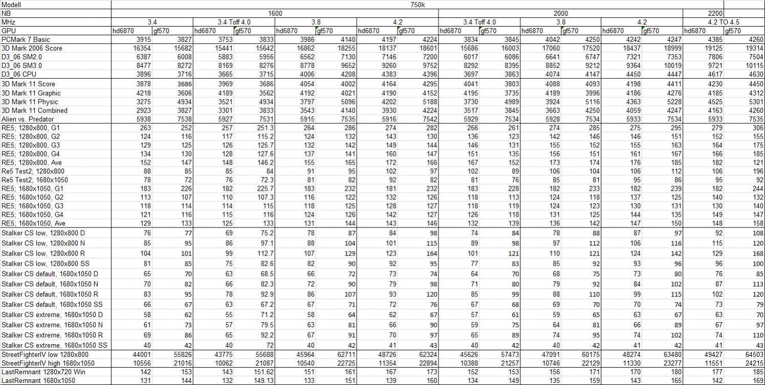 INSGESAMT ist die GF570 in der Tat und bei jeder Taktrate gegen 20% schneller. Ich habe dann (Nicht in den Bildern) testweise noch mit 2.5Ghz getestet. Da war die GF570 dann noch 5% schneller (Im Schnitt).