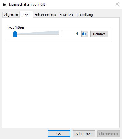 die Kopfhörer meiner Oculus Rift sind sehr laut - ich muss in den Rifteinstellungen den Pegel auf ~3 % stellen, damit mir nicht die Ohren abfallen; die Systemlautstärke ist auf 40-50 % gestellt.