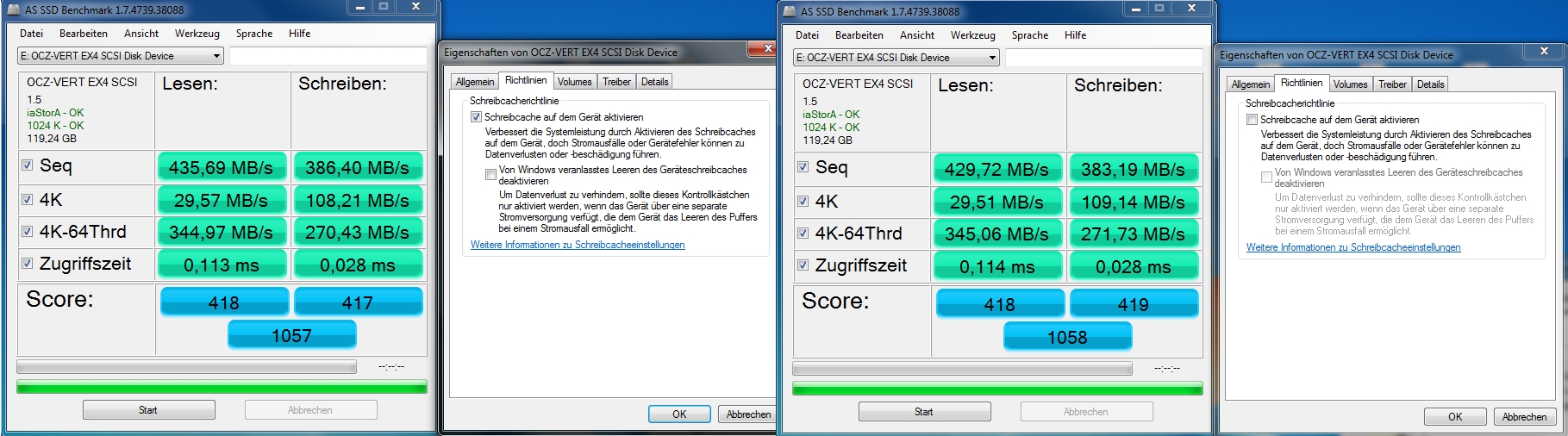 Bencht man so die SSDs mit dem AS-SSD, dann kommen da die normalen Schreibraten raus wie man sie aus Reviews kennt, nimmt man den Haken raus (beim Systemlaufwerk ist dann erst Reboot nötig damit die Einstellung übernommen wird), kommen viel schlechtere Schreibwerte raus, vor allem bei 4k Schreibend sind es nur weniger MB/s. So sieht es bei einer MX100 aus: