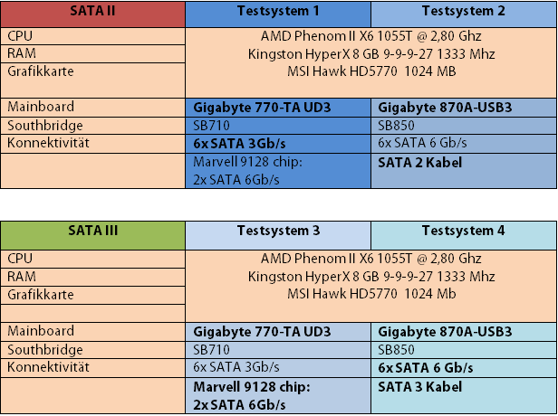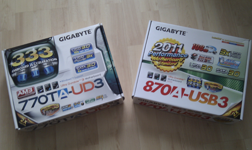 Dieses Review wird sich zum einen mit der Vertex 3 beschäftigen, als auch mit deren Zusammenspiel zweier Mainboards. Die Unterschiede der beiden Boards sind, dass das GA-770TA-UD3 eine veraltete Southbridge 710 als Controller einsetzt, das neuere GA-870-USB3 hingegen die neuste Southbridge SB850. Mit dieser sollten auch die besten Ergebnisse erzielt werden können.