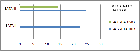 Gemessen wurde bei Erscheinen der Zeile "Loading Operating System" bis zum Erscheinen der Windows-Oberfäche plus 1 Sekunde. (Arithmetisches Mittel @ 6 Messungen, in Sek.)
