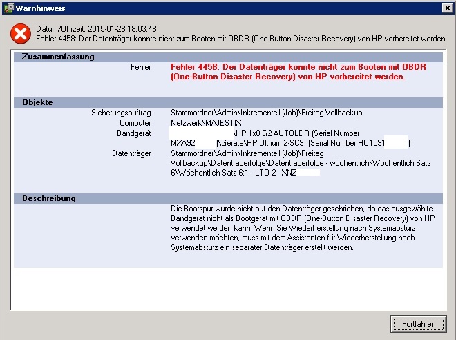 Das HP Backuptool (auf Band) meldet immer den Fehler OBDR 4458, welchen ich bisher immer ignorierte, doch es ist lästig und ich möchte ihn gerne wegbekommen.