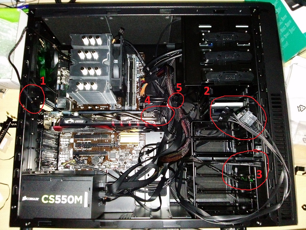 1. Markierung 1 zeigt das Kabel das vom hinteren Gehäuselüfter kommt. Wo wird das eingesteckt? Laut Anleitung kommt das ins NT, da ist bei mir aber gar kein Anschluss?
