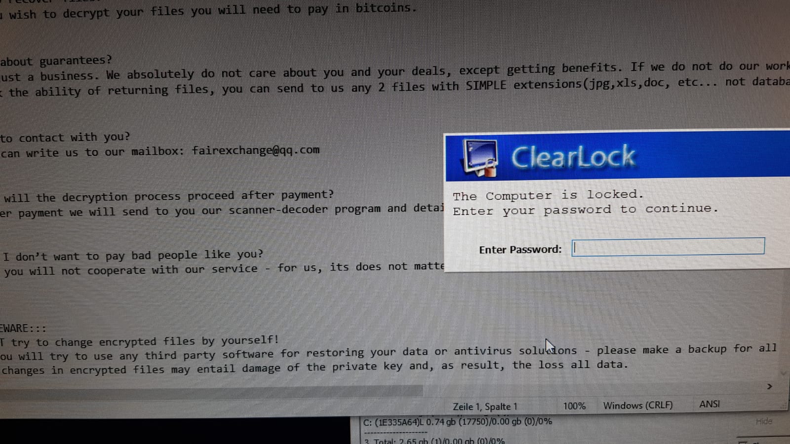 Also der Server wurde befallen und die Windows Oberfläche wurde gesperrt (Clear Lock). Desweiteren war im Hintergrund eine Textdatei. Der Hacker nennt sich "Makop".