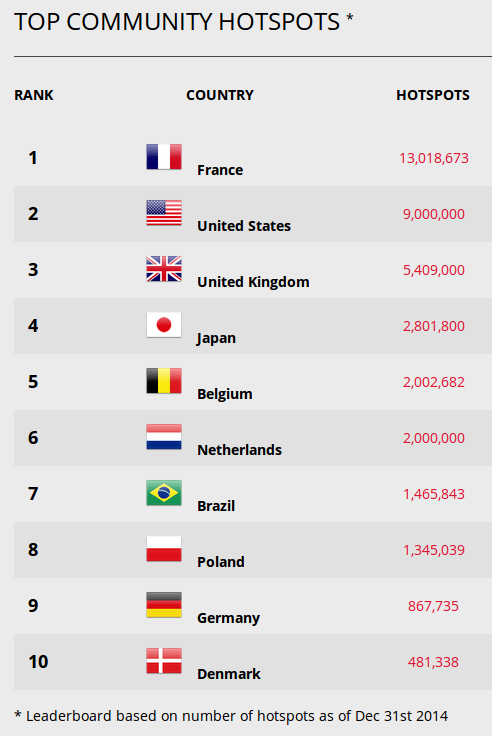 ipass.com ist Frankreich deutlich führend im Angebot öffentlicher Hotspots. UK ist auch gut dabei, den größten Wachstum gibt es durch Heimrouter (privat oder durch ISP).