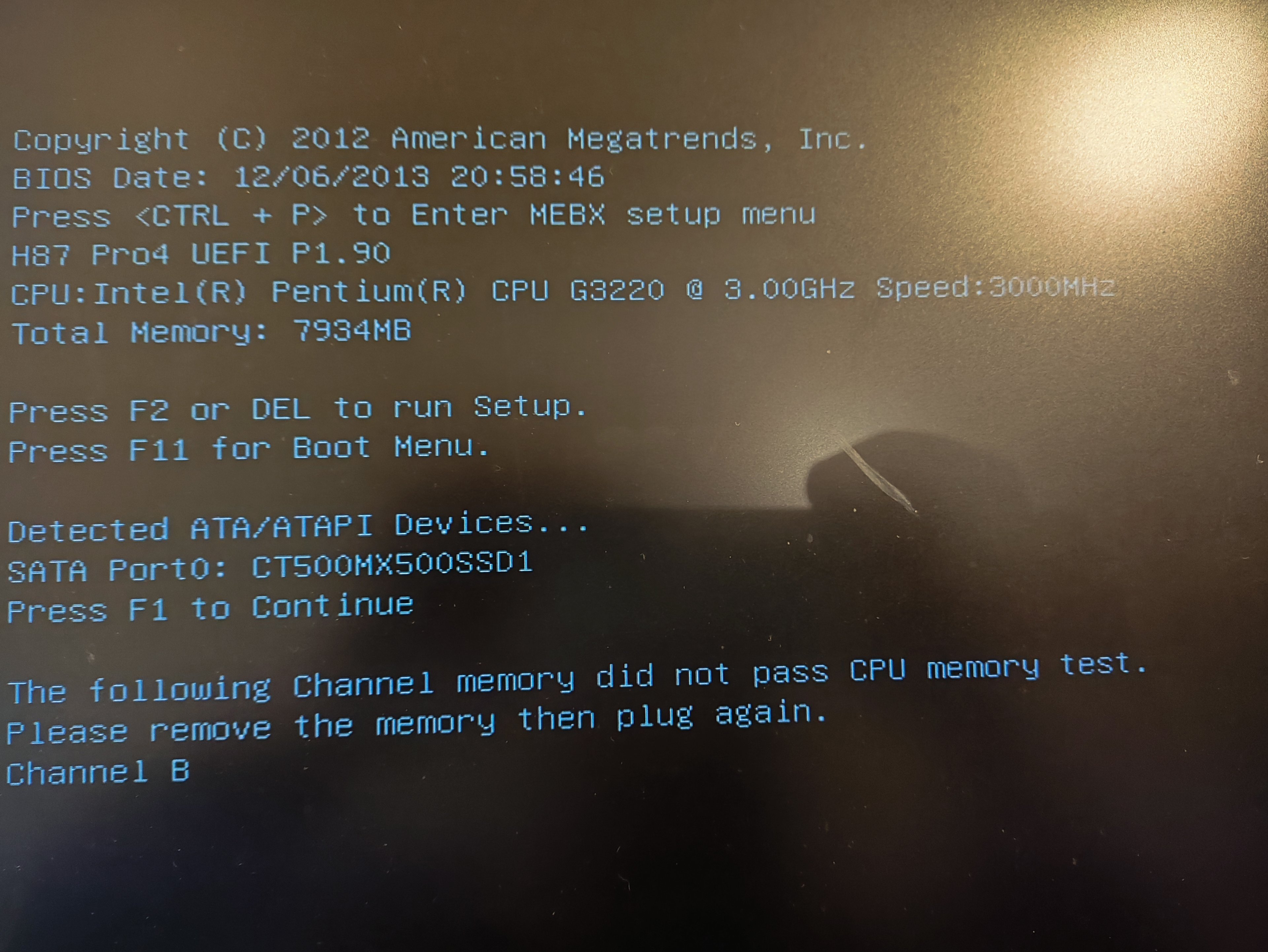 Auf dem Monitor stand: "The following Channel memory did not pass CPU memory test. Please remove the memory then plug again. Channel B"