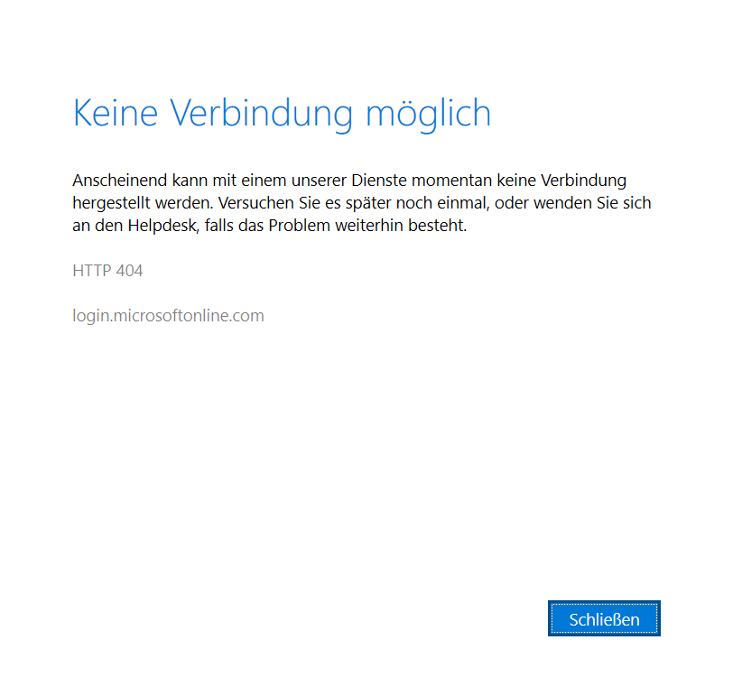Wie kann das sein ? Internet-Verbindung besteht doch beim Installieren, welche Verbindung klappt denn da nicht ? kann man das irgendwie rausfinden ? login.microsoftonline.com geht in meinem Browser auf... wobei das 404 in der Meldung doch not found heißt ?