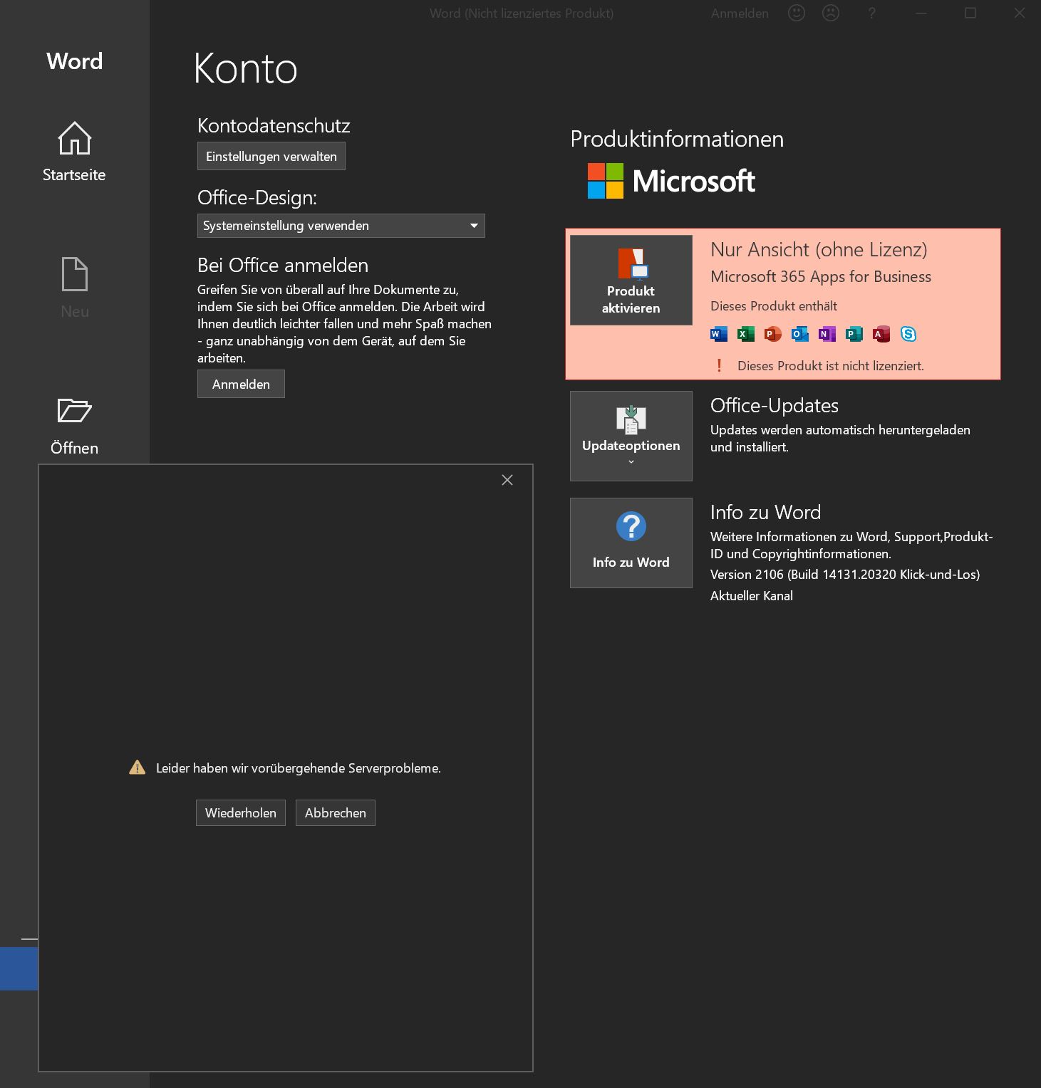 seit einigen Tagen funktionieren meine Office-Produkte nicht mehr. Zuerst bekam ich im Word eine Benachrichtigung, dass meine Lizenz nicht überprüft werden konnte, einen Tag später nur noch Lesemodus. Das letzte halbe Jahr keine Probleme gehabt. An meiner Lizenz, Internetverbindung oder PC hat sich eigentlich nichts geändert. Lizenz ist eine Microsoft 365 Business Standard.