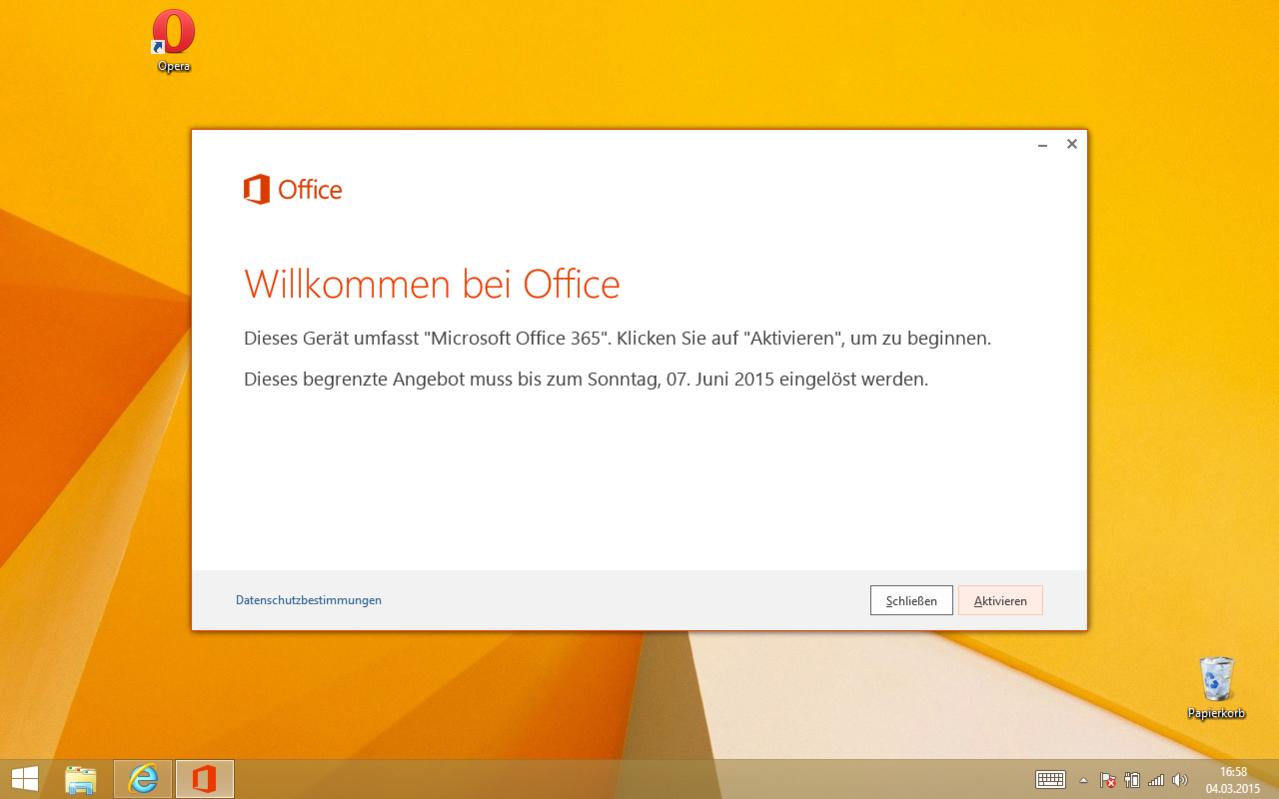 Habe vor kurzem ein Tablet-PC gekauft und dazu 1 Jahr das Office 365 Gratis bekommen (Ohne Key). Es war schon vorinstelliert und ich musste es nur noch Aktivieren als ich es Aktivieren wollte kam folgendes :