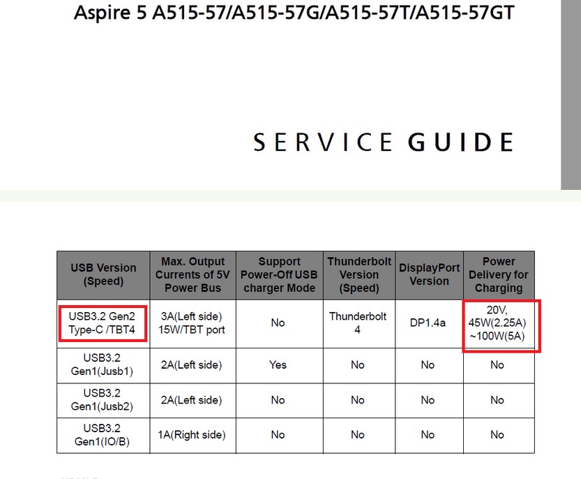 Der Acer hat einen Thunderbolt 4 usb-c mit 40Gb/s und Laden mit 65watt über diesen Port.