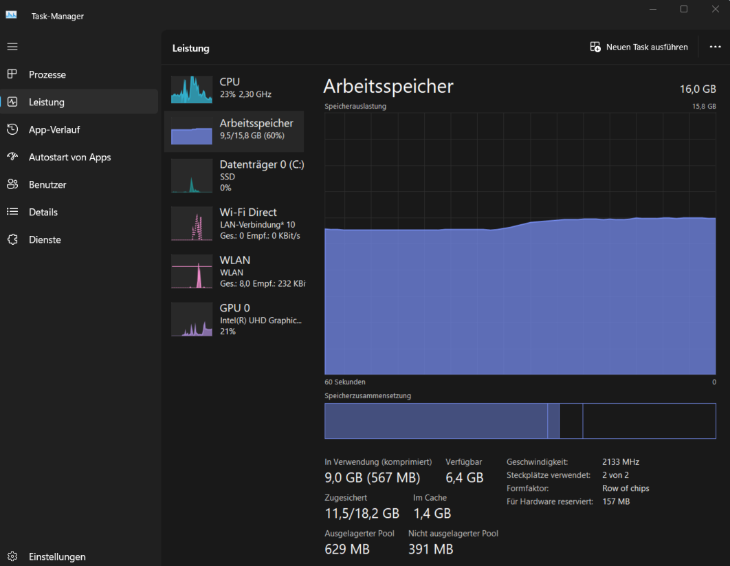 4. Thema RAM: Bisher habe ich 16GB Ram. Mein aktueller Laptop ist häufig etwas träge und stockt beim Öffnen von Ordnern oder Dateien. Ich habe aber eher das Gefühl, dass die CPU (i5-8250U) das Problem ist. Die Festplatte sollte es eher nicht sein (512GB NVMe, PCIE 3.0). Die RAM-Auslastung liegt in der Regel bei 8-10GB (siehe angehängtes Foto). Allerdings steht da etwas von zugesicherten 18GB? Heißt das, dass ein Teil auf die Festplatte ausgelagert wird? Könnte ich das umgehen und würde den einzelnen Programmen mehr RAM zugewiesen, wenn ich 32GB RAM hätte, sodass einzelne Prozesse schneller ablaufen?