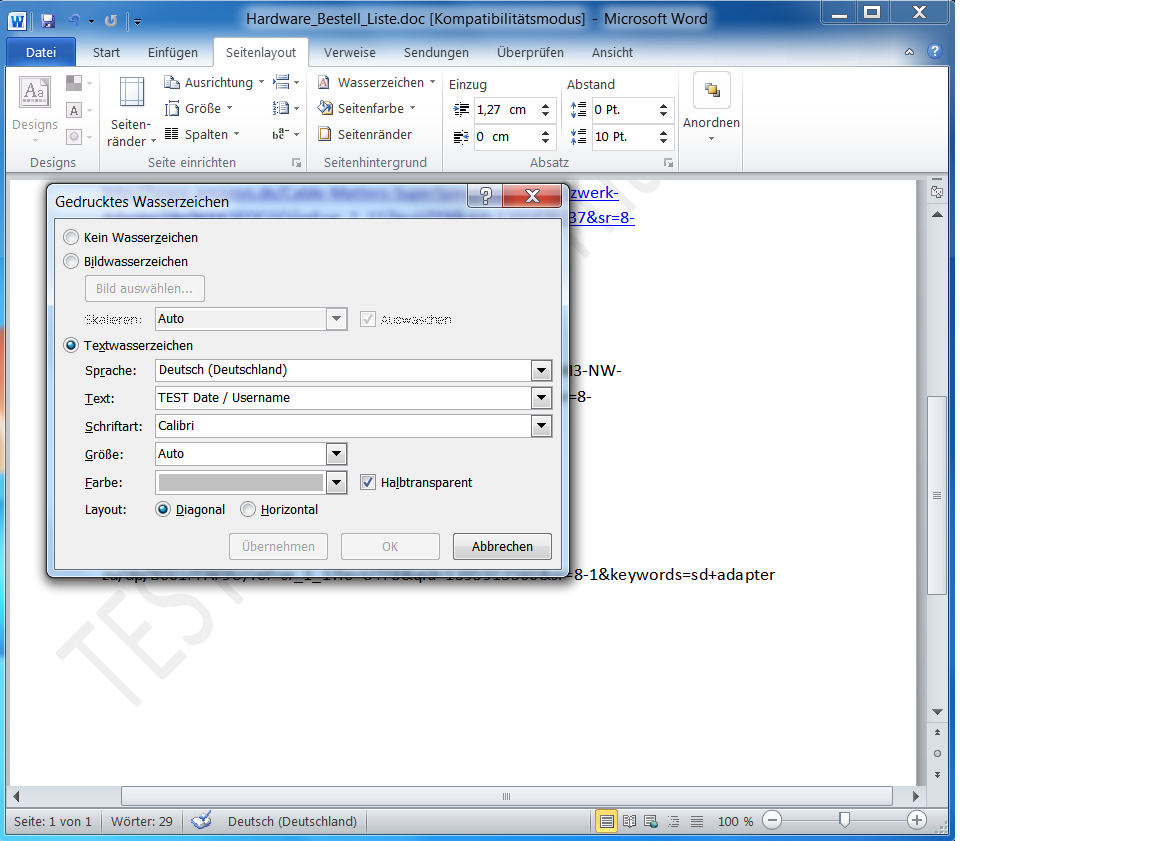 suche nach einer bestimmten Möglichkeit eine Word Datei mit einem Wasserzeichen zu versehen. Auf die Datei haben mehrere Benutzer Lesezugriff und wenn sie die Datei drucken soll auf ihr ein Wasserzeichen erscheinen mit 2 Variablen und einem vorgegebene Text, z.B. "Datums Variable" + TEST123 + "Benutzername Variable". Eine Benutzerin benötigt allerdings die Möglichkeit das Dokument zu überarbeiten. Meine erste Idee war direkt im Word Dokument ein Wasserzeichen anzulegen, allerdings habe ich keine Lösung gefunden ob es die Möglichkeit gibt in der Word internen Wasserzeichenfunktion Variablen und Text einzufügen. Vielleicht habt ihr auch Ideen für einen einfacheren und besseren Weg.