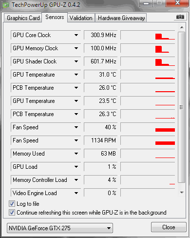 Die Spannung im 2D-Modus liegt bei 1,05V. Die kann man leider auch mit dem nibitor nicht weiter runterstellen. Die 3D-Spannung liegt bei 1,17V. Die kann man zwar runterstellen, allerdings hat die GTX 275 diesbezüglich nicht viel Potenzial.