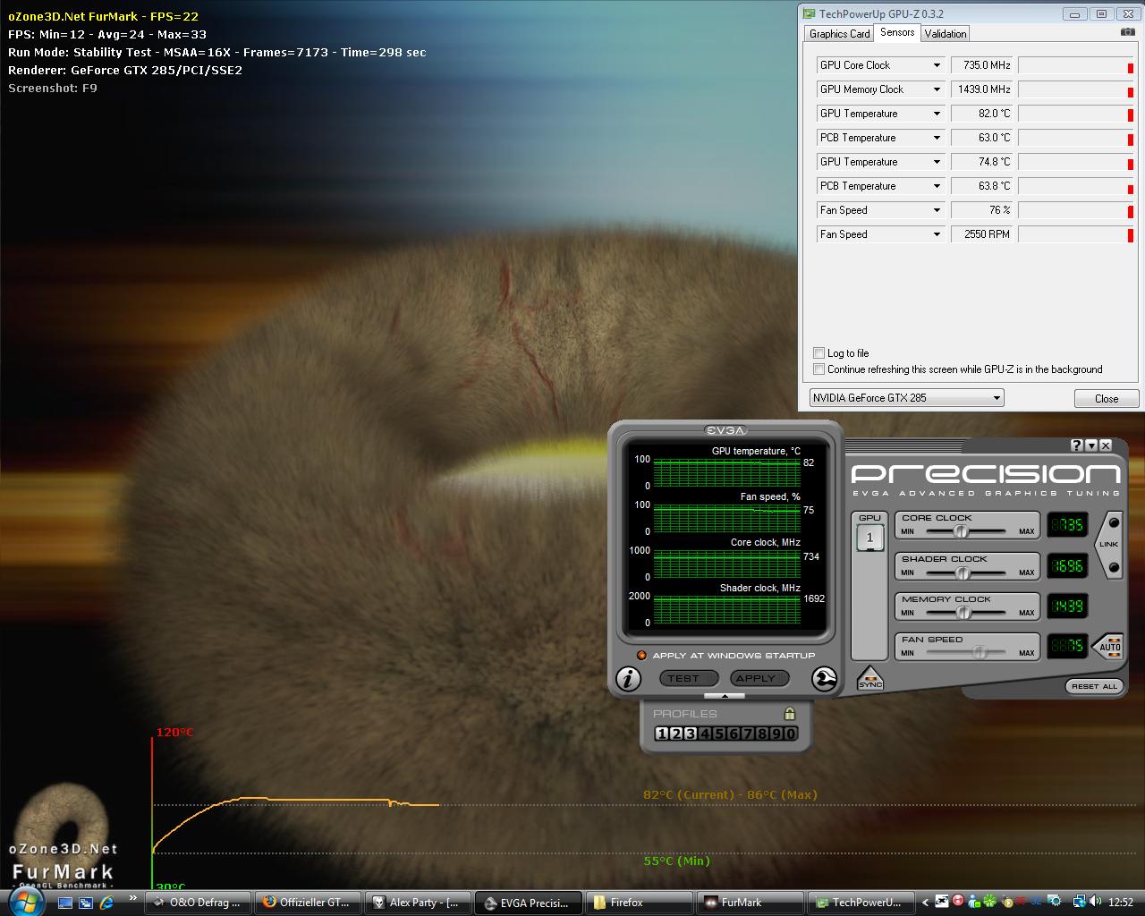Andere Frage: ich habe den min. duty cycle für 2-D Betrieb auf 20% gedrosselt. Trotzdem entspricht das 1300 Umdrehungen? Bei der GTX280 waren 25% nur noch ca. 900 Umdrehungen?? Kann es sein, dass die Lüftersteeurung gar nicht funktioniert?