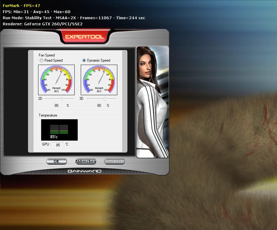 Der Lüfter bleibt erstaunlich leise, ich höre ihn unter Last bei 45 % (830 U/min) nur leise und er ist keinesfalls störend (und ich hatte vorher eine passive 8800 GT drin). Temperatur bleibt bei ATITool-Last auf maximal 71°C Core-Temperatur, geschätzte Raumtemperatur liegt bei 25°C.