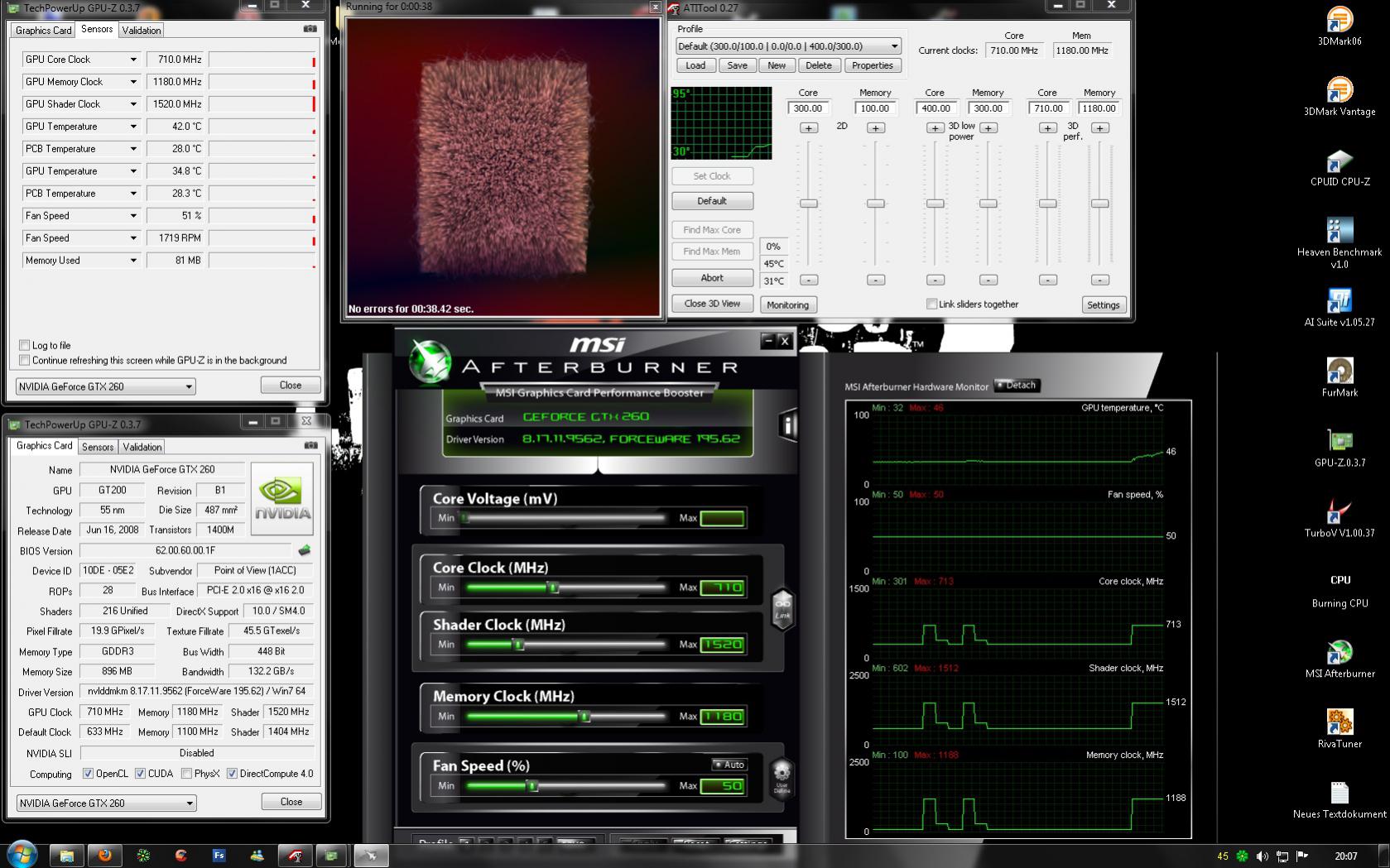 so einen ähnlichen Fall hatten wir erst vor kurzem hier im Thread. Alles zurück auf Stock und nochmal langsam testen. Vor allem der Speicher erscheint mir deutlich zu hoch. Zuerst wirklich stabile Werte für Shader/Core mit Standard-Speichertakt ermitteln, erst anschließend den Speicher anheben. Meiner Erfahrung nach vertragen recht viele Karten keinen allzu hohen Speichertakt - und steigen t.w. bereits bei sehr gering erscheinenden 1100Mhz aus. Man sollte für ein Erreichen stabiler Werte niemals alles gleichzeitig und auf einmal anheben, sondern immer chronologisch und sehr langsam vorgehen. Alles andere kann ggf. zu den von dir festgestellten Problemen führen.meine taktraten laufen einfach nicht stabil nichtmal 700,1500,1150