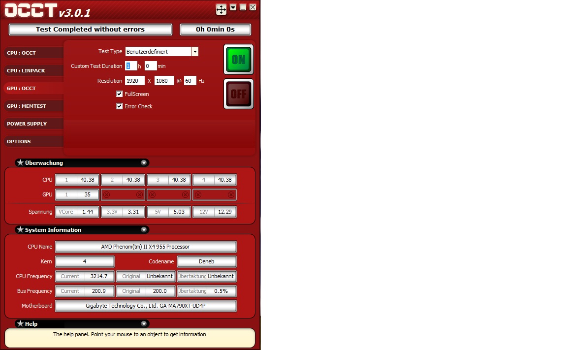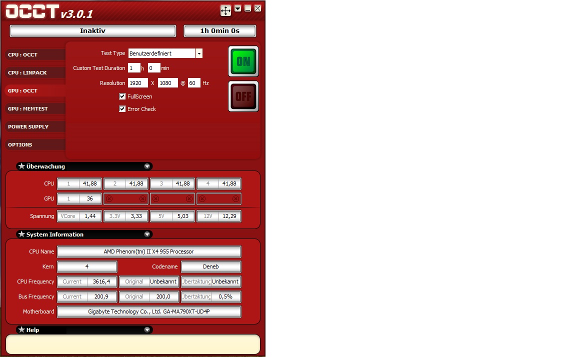 Also meine GTX 260 hat ein eigenleben, eben teste ich 3,910ghz beim Q9550 mit 1,232Vcore und was macht die karte währendessen, dreht auf 2293U/min statt mit 1450. LOL Zotac macht mir sorgen.