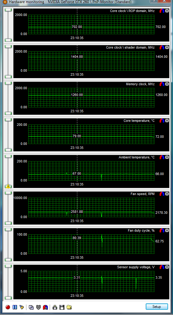 so, ich habe BIOS geflasht (1,06V und Lüftersteuerung), 20 Min FurMark in Vista x64 bei 702/1260/1404 stabil (Temps und co. siehe Anhang). Unter Vista bekomme ich 32Bit Crysis nicht zum laufen, 64bit habe ich nicht werde dann mir GTAIV holen und "testen".
