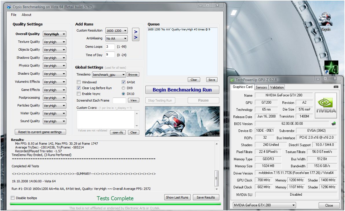 Run #1- DX10 1600x1200 AA=No AA, 64 bit test, Quality: VeryHigh ~~ Overall Average FPS: 2572