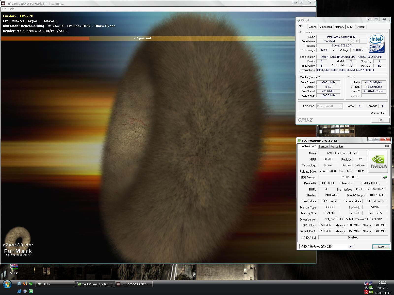 Meine POV GTX 280 läuft auf 702/1512/1188 MHz mit Furmark 1.5 1280x1024@75MHz - 16xMSAA - Extreme Burning Mode auf maximal 84-85°C nach ca. einer Stunde.