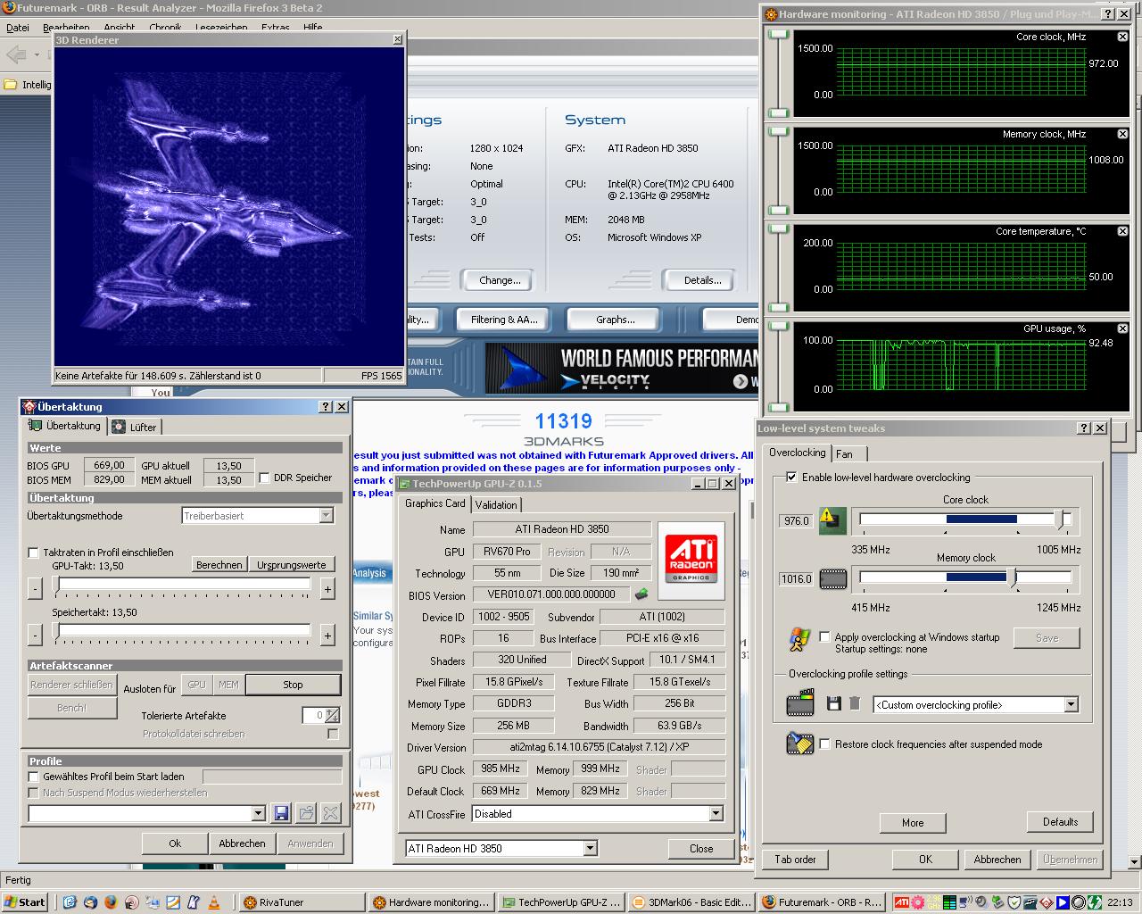 Meine Karte läuft im normalen Takt, da dieser zur Zeit völlig ausreicht. Kann damit alles auf High spielen, inklusive Crysis-Demo. Um zu sehen was ich aus der Karte rausholen kann habe ich ein wenig mit dem ATI Tool gespielt, komme damit auf 783Mhz Core und 1062 Speichertakt. Alles darüber verursacht Artefakte auf dem Wollknoll, ist aus der Karte trotzdem noch mehr rauszuholen oder ist hier schluss?