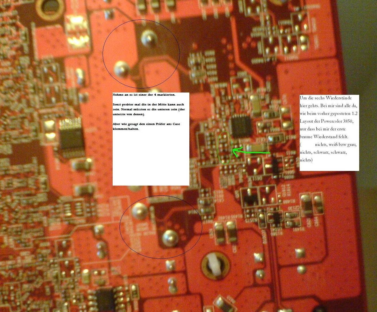 Wieder etwas beruhigt bin ich dann wieder zum PC hab ihn eingeschaltet und alles wie vorher. Die Karte wird beim Rialto warm, der Chip und der VRam wird auch warm und sowohl an den Kurzgeschlossenen Messpunkten als auch an den VGPU Messpunkten und an den Pins des DVI Ausgangs war Spannung vorhanden. Das was noch komisch ist, ist dass das System bootet wenn ich die Karte drin hab, nur halt eben ohne Bild