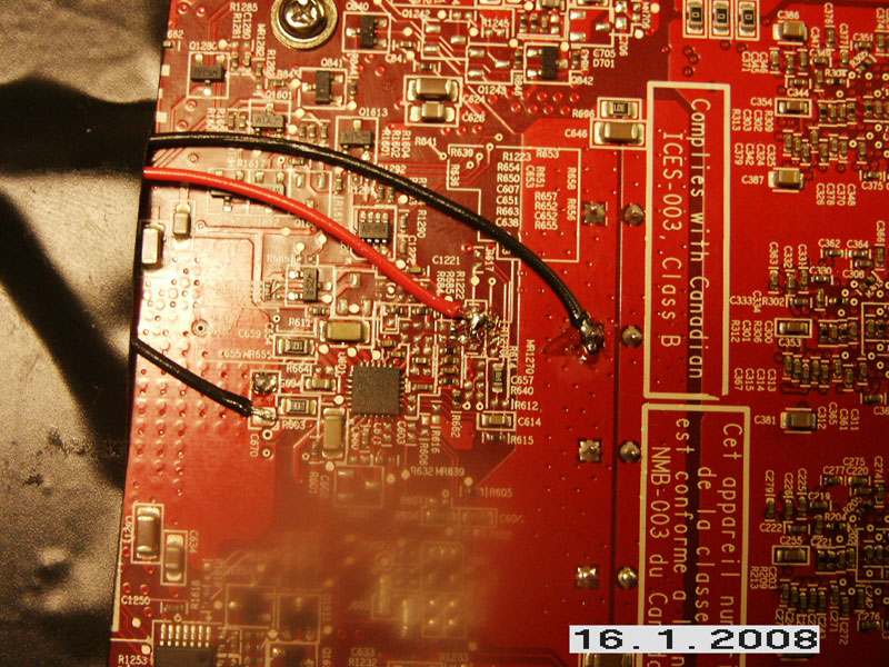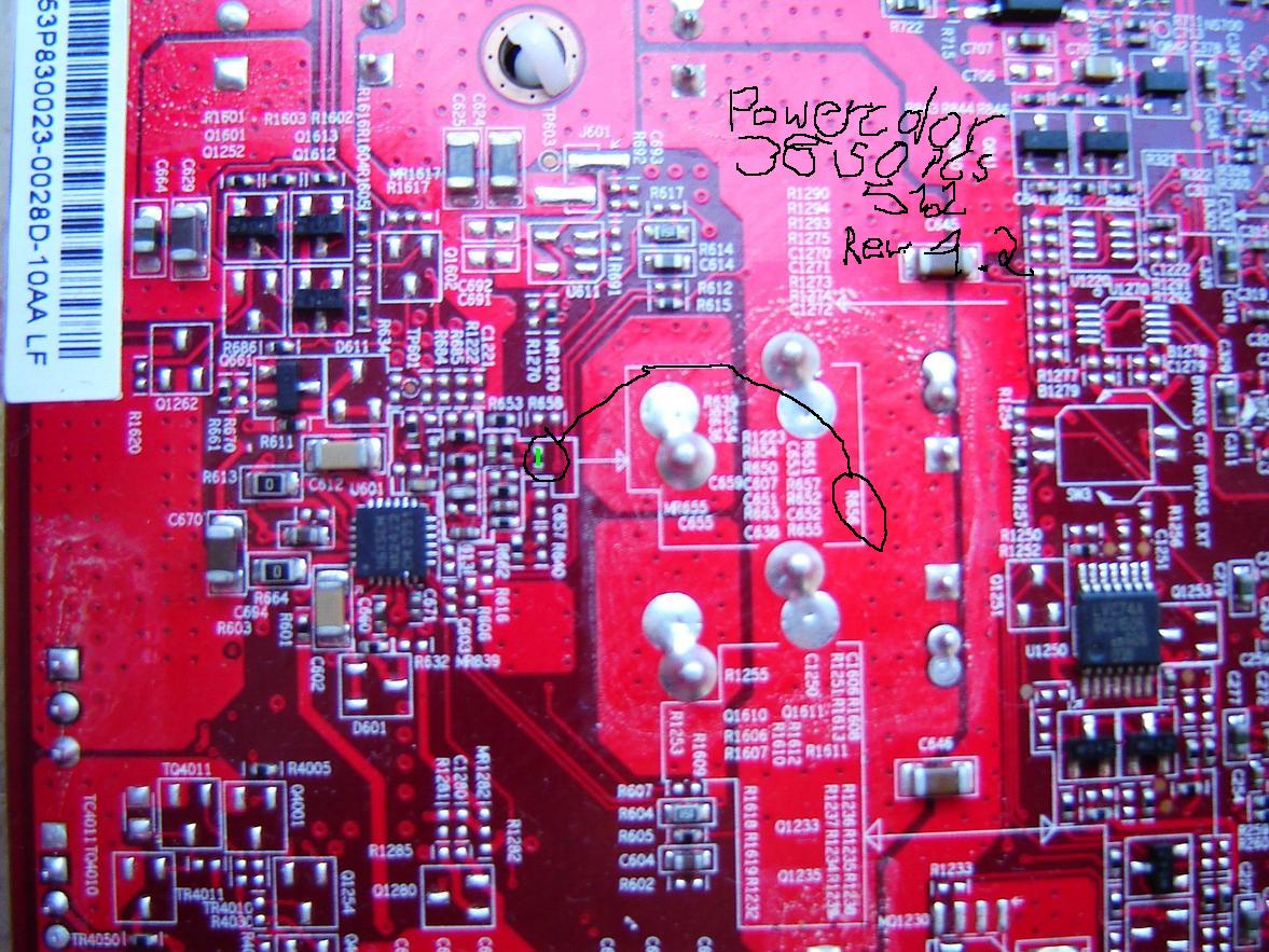 @Julle, Deine Karte sieht so aus oder(siehe Bild).Bei Dir ist der Widerstand vorhanden(656),welcher bei der Revision 1.0 nicht vorhanden ist und an welchem der Mod durchgeführt wird.(Siehe Bilder vorherige Posts). Zitat aus dem Thread wo ich das Bild gefunden hab.:The vmod is the same for the 3850(which is shown above) and the 3870,just the vgpu measure points are differant