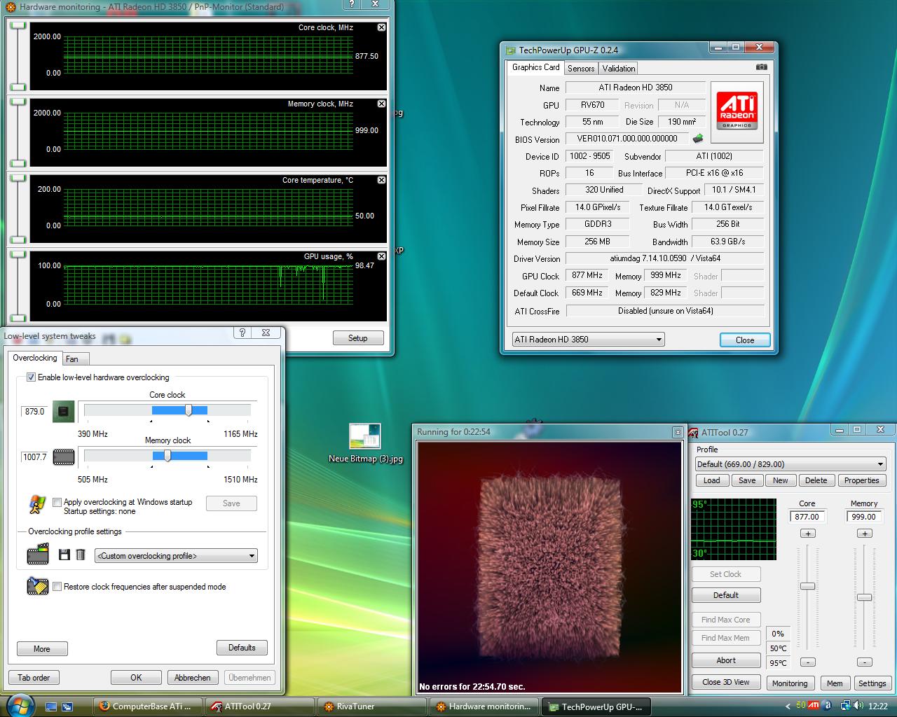 Jedoch ist mir ein Rätsel, wie du den RAM soweit raufgebracht hast. Denn bei mir geht er @2,1V grad mal bis 1070Mhz. @1,9V jedoch auf 1025Mhz. Entweder ich hab da was falsch gemacht, oder der VRAM geht einfach nicht besser.
