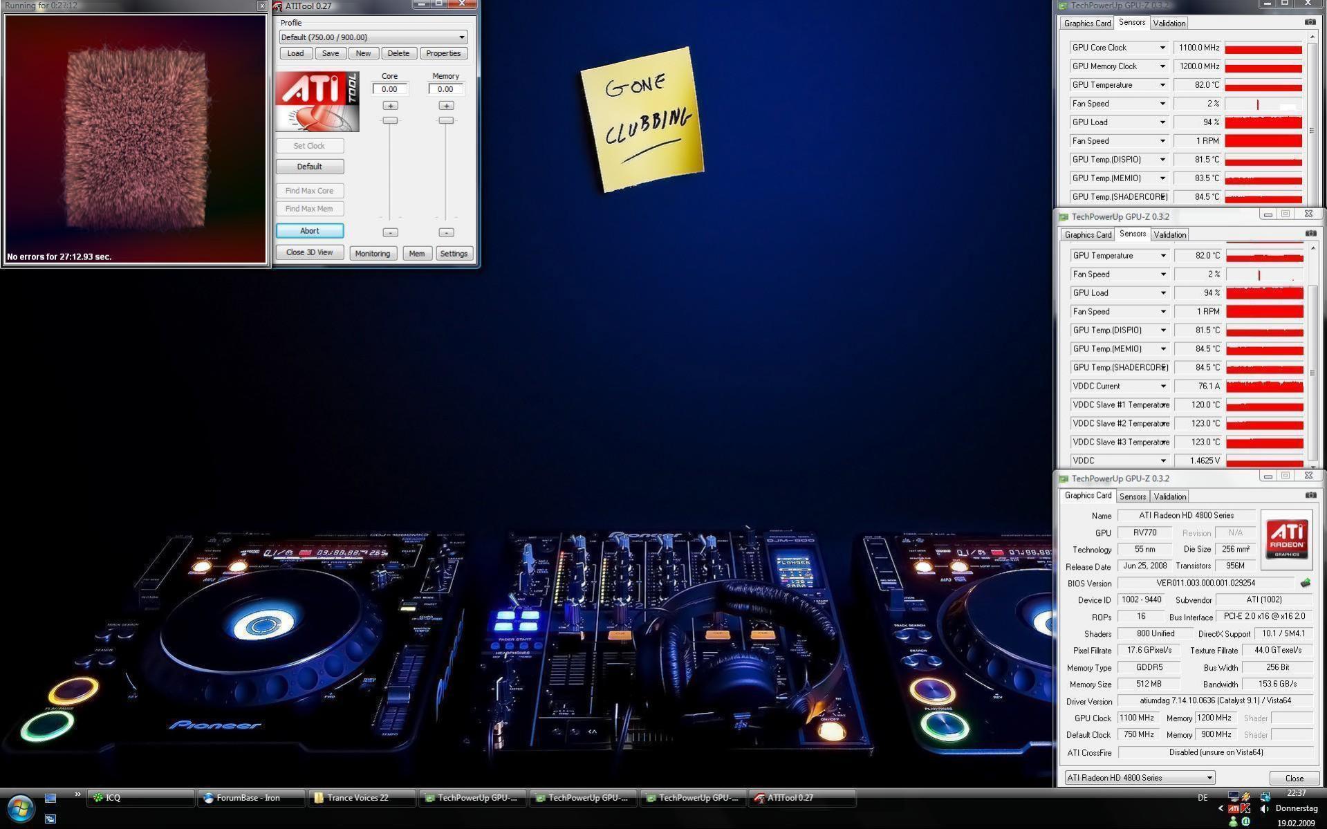 GeOCed habe ich mit RivaTuner - auch mit ATT hab ich es mal probiert, aber da waren die Möglichkeiten, zumindest subjektiv gesehen, noch eingeschränkter - auf Grafikfehler mit FurMark getestet und die max. Temperatur ebenfalls mit FurMark ermittelt.