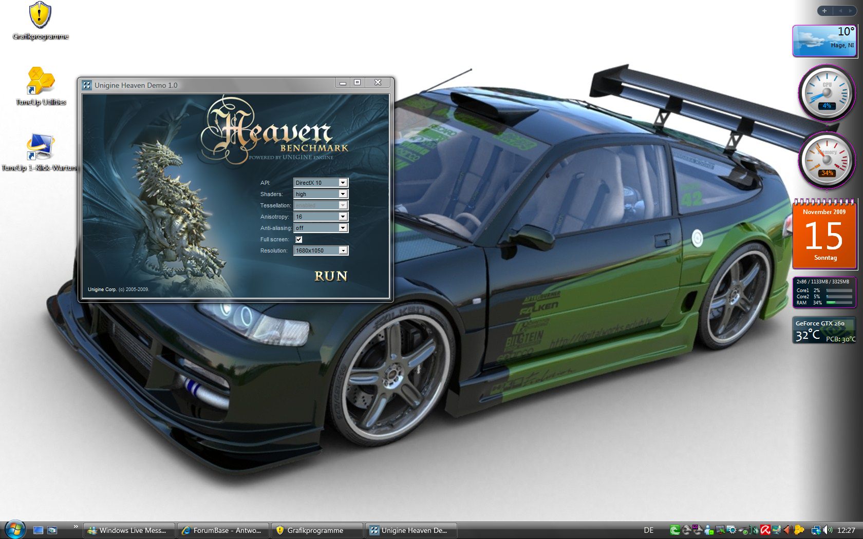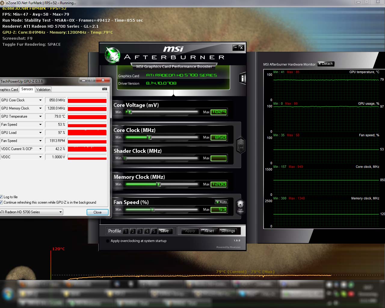 HIS 5770 mit Standardtakt, d.h. 850/1200 MHz und undervolting auf 1,025V. Bei <1,010V gibts artefakte.