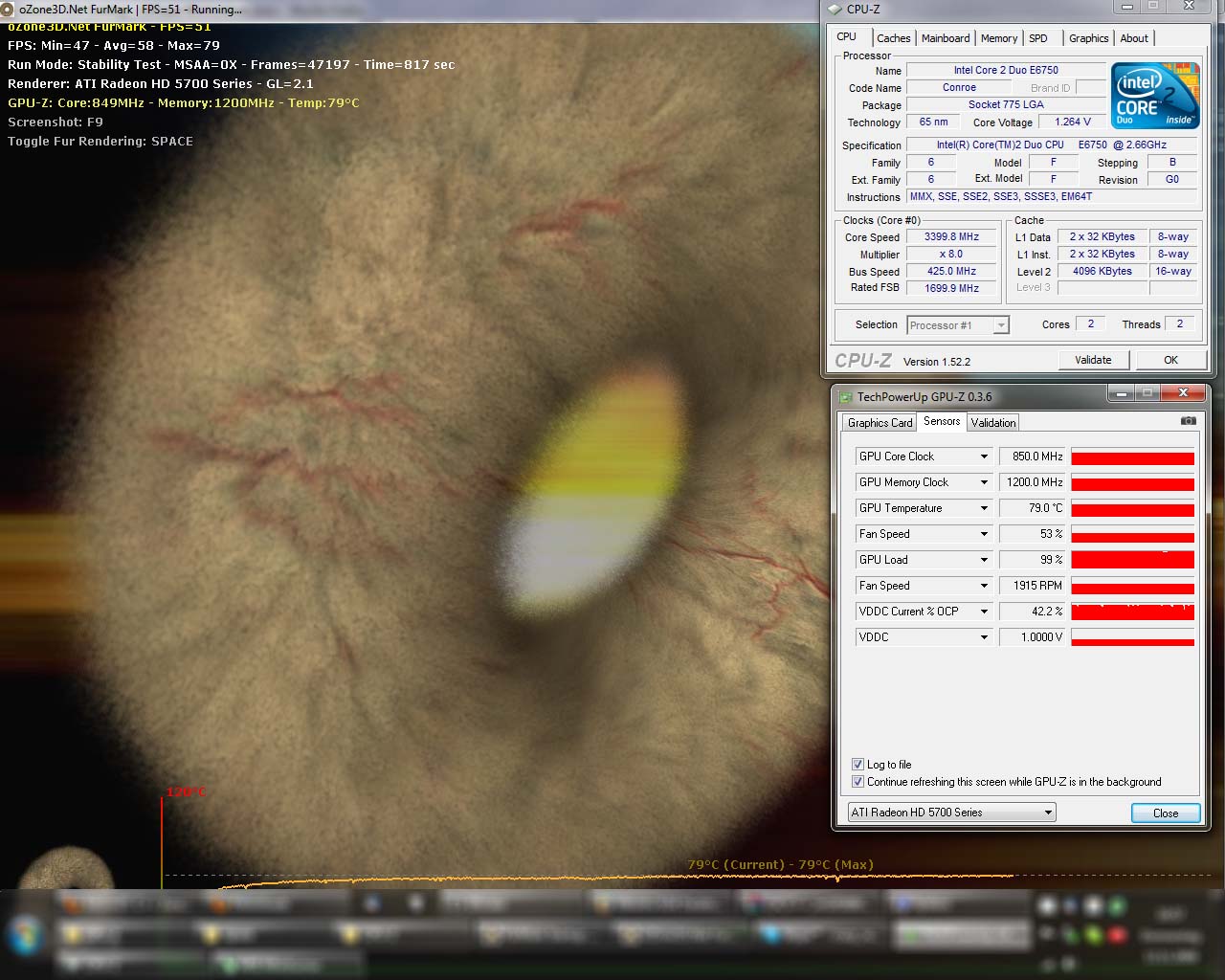 Maximale Temperatur bei Furmark 79 °C, im Idle 43 °C mit Stock-Kühler