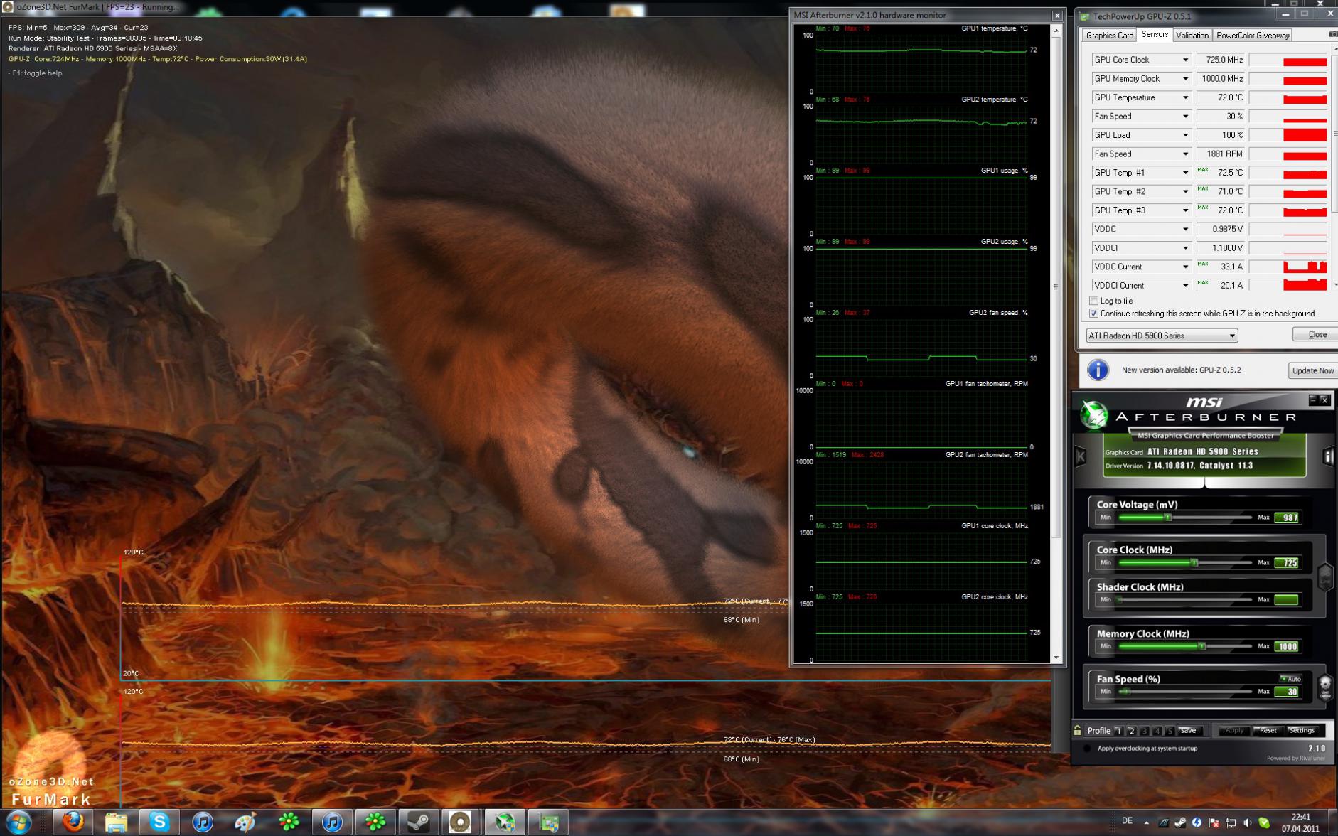 spielt mal crysis 2 mit euren werten. meine lief mit 950 MHz wochenlang stabil bei 1,200 V. Bei crysis kackte die karte aber immer ab