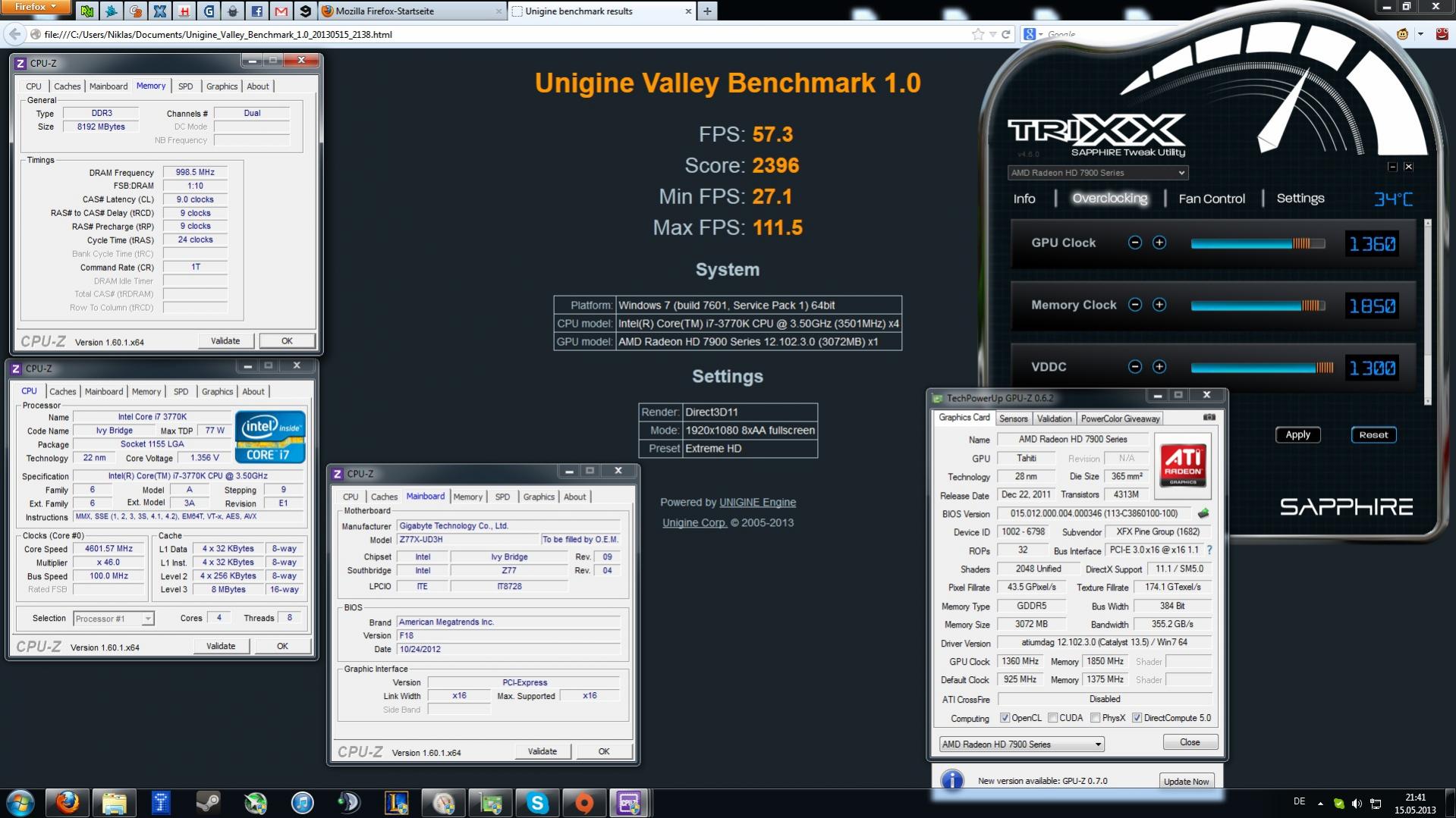 Dann habe ich direkt die zweite Karte eingebaut, die macht aber leider nicht mal 1,2GHz bei 1,3V mit (GHz Edition Vapor-X). Damit habe ich dann mal einen Vantage im Xtreme Preset laufen lassen.
