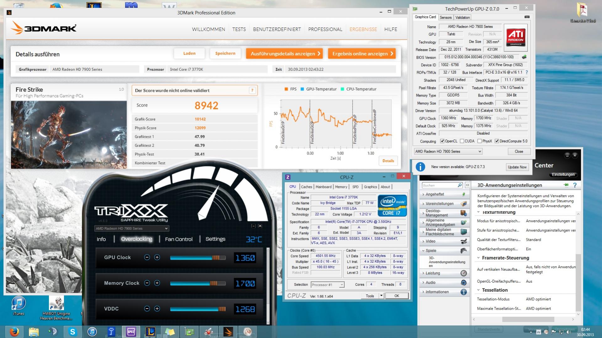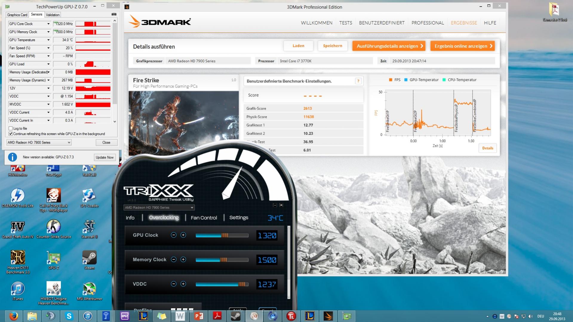Im Anhang ist noch ein schneller 3D Mark 2013 Firestrike _mit_ Tessellation. Ram läuft auch mit 1950MHz noch durch, und damit skaliert der Score richtig gut (rund 200 Punkte pro 100MHz Ram), aber es war kein ernsthafter Bench.
