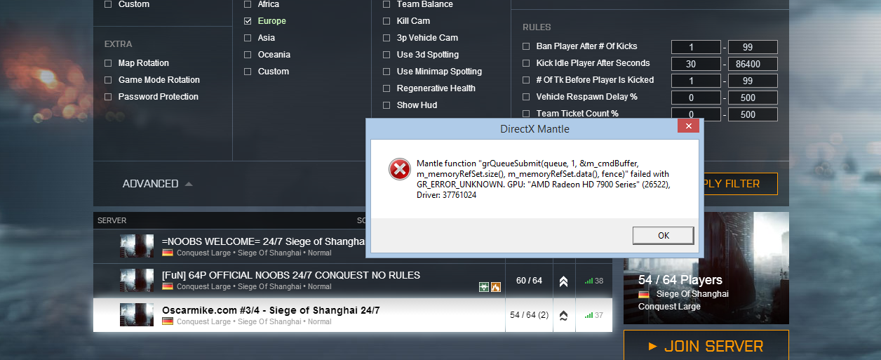 Nach dem nächsten Reset habe ich wieder den Takt reduziert, spiel lief mit den selben einstellungen immernoch flüssig, kein GSOD aber stattdessen ist Mantle angestürzt. Das sah dann so aus: