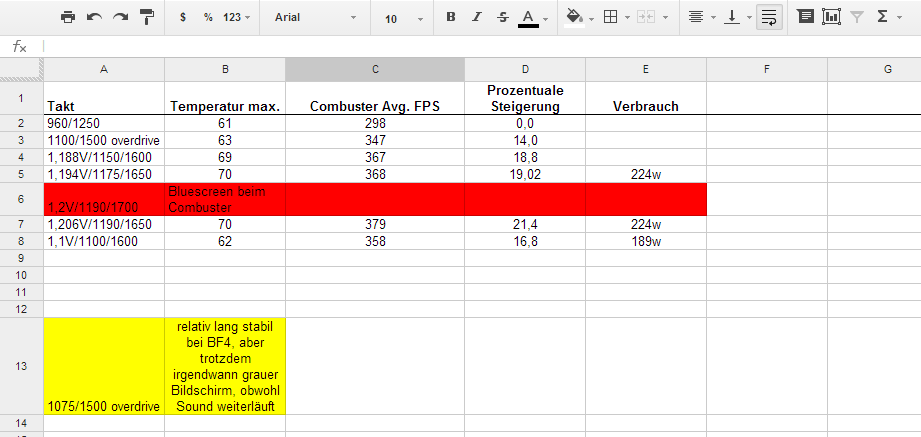 Da die Karte nicht ausgereicht hat, um meinen Ansprüchen bei BF4 gerecht zu werden, hab ich ein bisschen OC betrieben. Ich hab mit dem Afterburner und Catalyst 14.3 folgende Ergebnisse erzielt und mit dem Kombuster Stress Test die Stabilität geprüft. Bis auf eine Messung lief auch alles stabil und die Temperaturen waren auch soweit noch im grünen Bereich.
