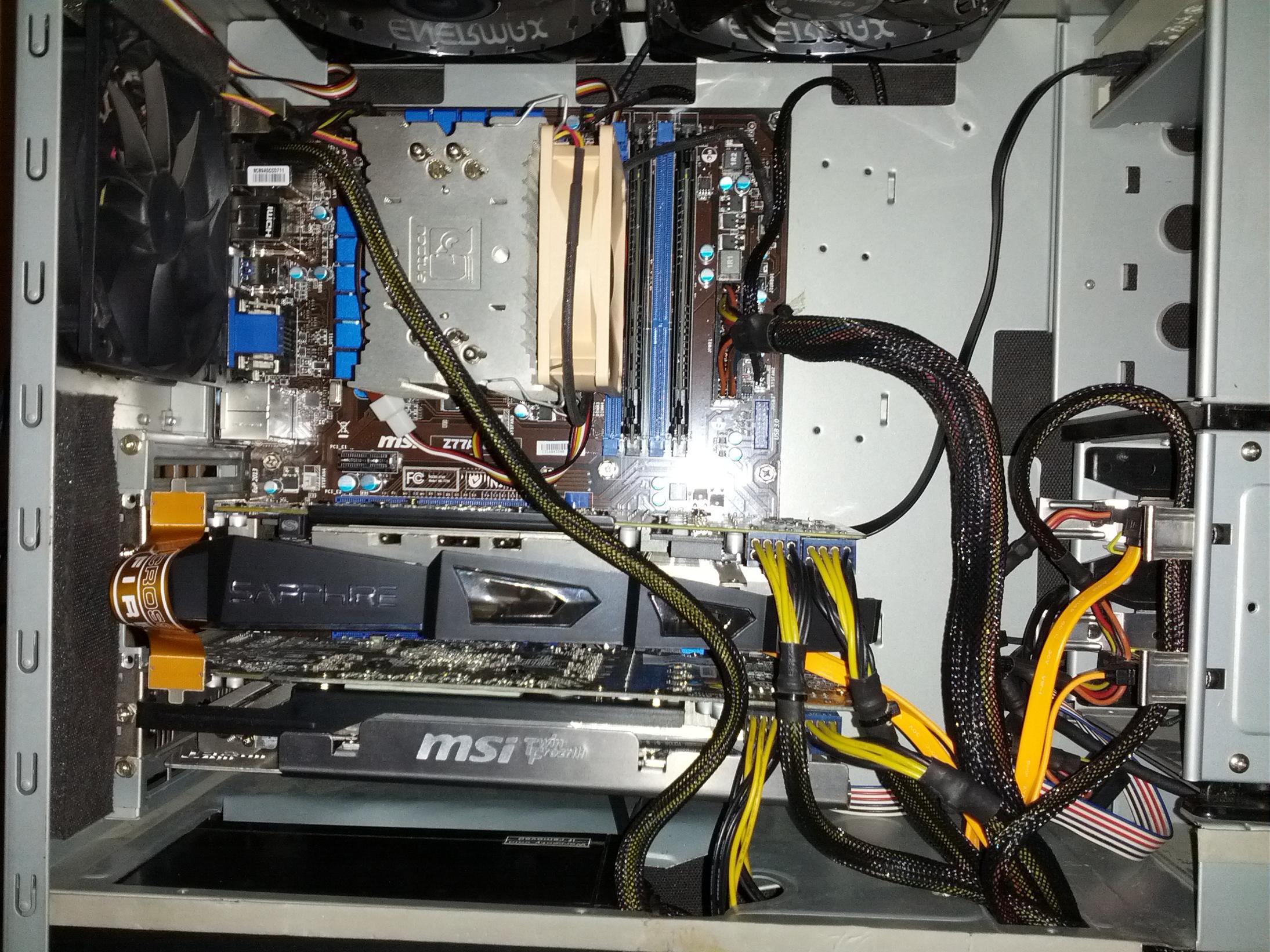 ja klar kann ich machen, aber ich hab das Tystem bisher nur in offenem zustand betrieben. Testweise hab ich einen 120er Luefter auf höhe der beiden Karten platziert (provisorisch), es war zwischen 7 und 9 grad kaelter, wenn der Luftstrom in Richtung der karten geblasen hat, das absaugen der Luft hat sogut wie keine Verbesserung nach sich gezogen.