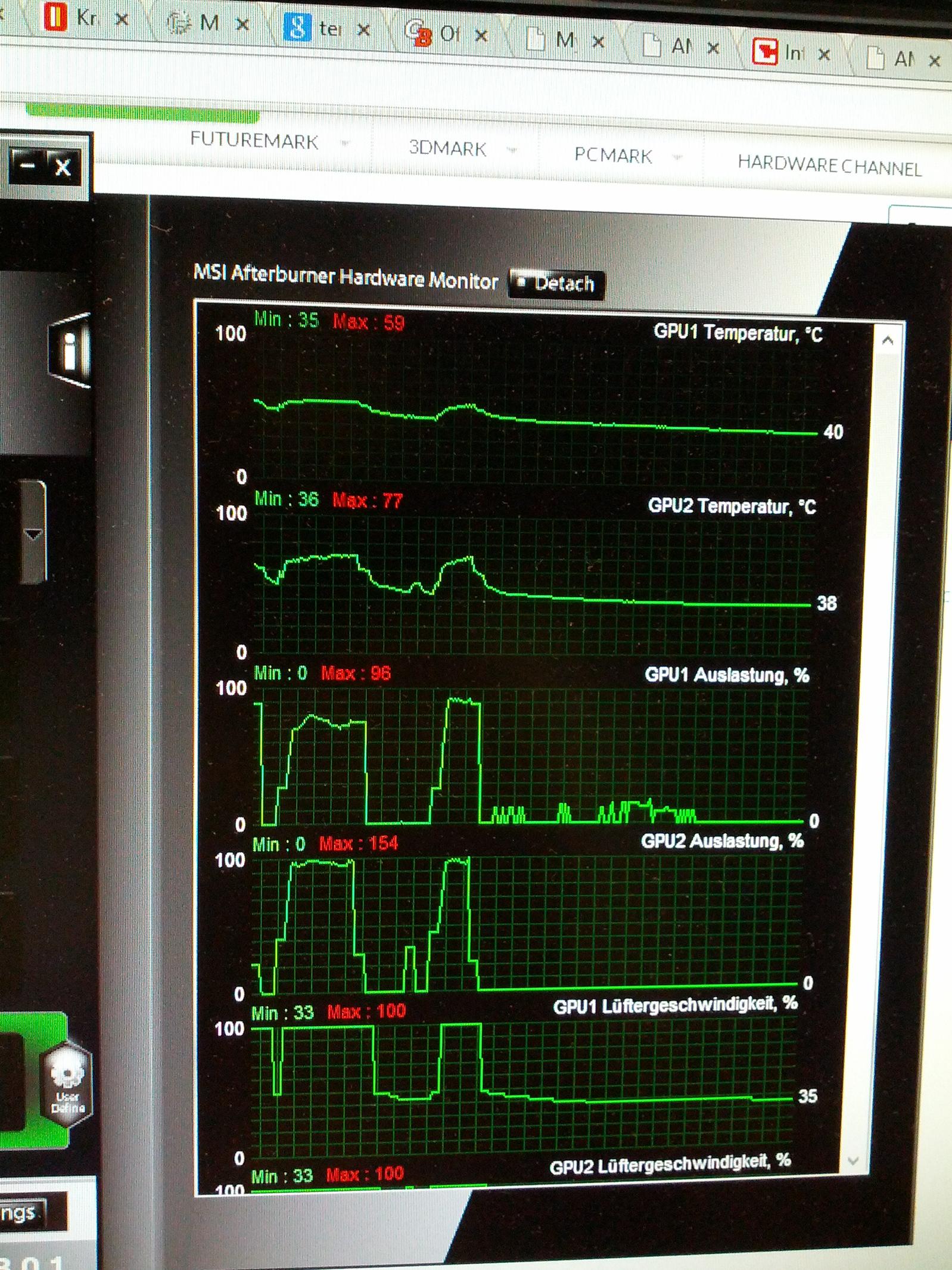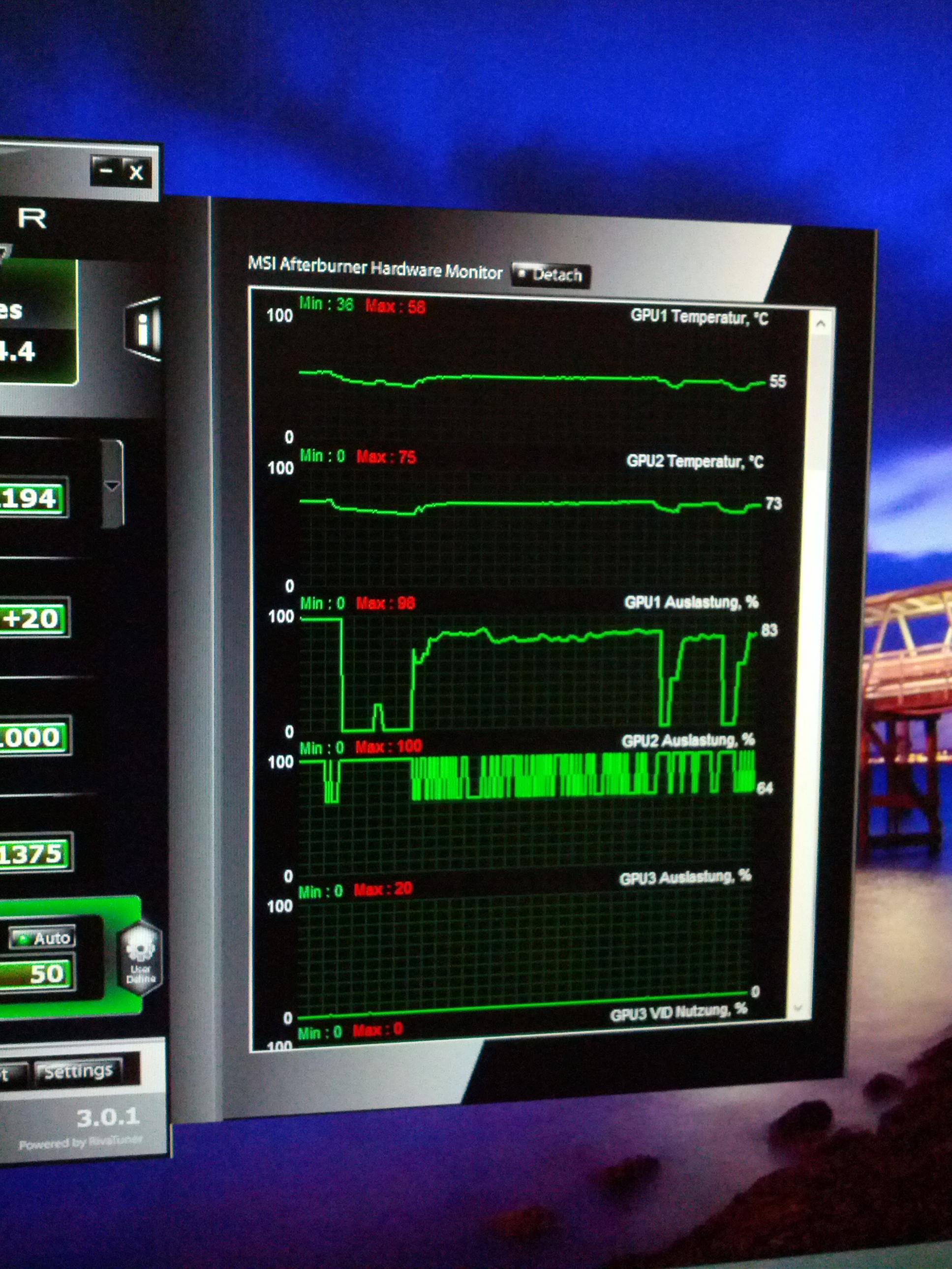 Ich habe noch ein Bild von den Auslastungen gemacht, mir ist aufgefallen, dass die Master Karte konstant ausgelastet war und die Slave Karte teilweise ziemlich osziliert hat.